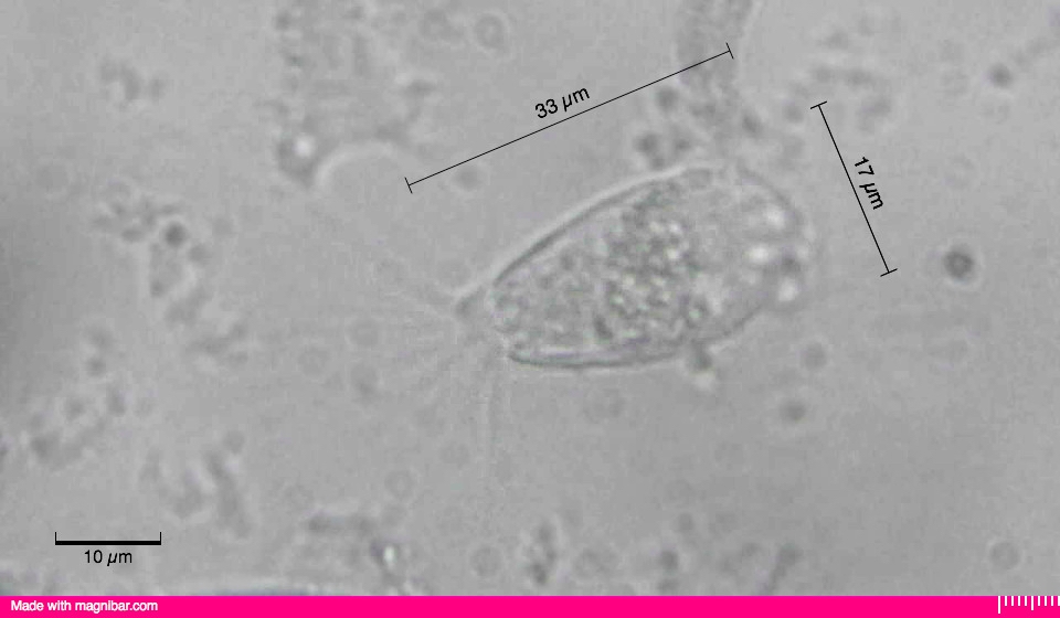 Feigenförmiger Körper ca. 33µm lang und 17µm breit etwas abgeplattet. Am schmaleren Ende sind mehrere (auf dem Bild sind 6 zu erkennen, hat möglicherweise aber mehr) fadenförmige "Füsse" angeordnet die, wie im Video zu erkennen, der Fortbewegung dienen. Das Standbild ist leider etwas unscharf und farbneutral, im Video kann man es etwas besser erkennen.