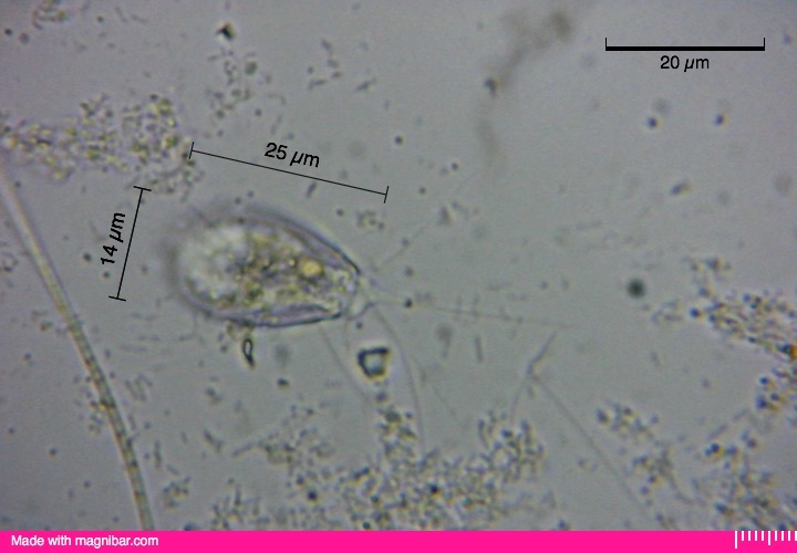 Ich bin mir nicht sicher ob es sich hierbei um ein einziges Exemplar handelt, da ich in der Probe mehrere dieser feigenförmigen 'Tierchen' habe von welchen sich aber nur wenige fortbewegen. Eventuell handelt es sich bei denen um eine Kombination von zwei verschiedenen Exemplaren und das eine hat das andere nur im 'Huckepack'.