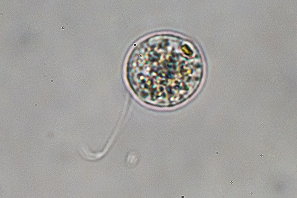 Durchmesser ca. 5µm. Zwei Flagella, es wirkte manchmal, als würden sie sich teils mit einem auf dem Boden des Präparates festhalten und mit dem anderen navigieren. Freischwimmend unterwegs sind sie durchaus flott und schwimmen mit den Flagella voraus. Auffällig war auch die (meistens) absolut kreisrunde Form.