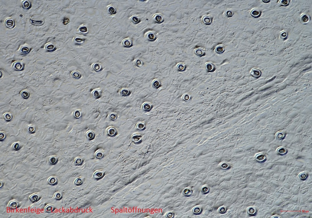 Gerne möchte ich euch einen Lackabdruck (von der Blattunterseite mit Nagellack) sowie Flächenschnitte, ebenfalls von der Blattunterseite zeigen.