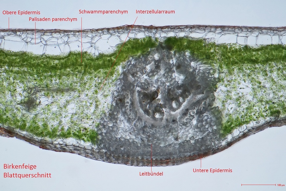 Mit der Beschriftung des Blattquerschnitts bin ich aber nicht ganz einverstanden. Ich hoffe, Du bist mir nicht böse, aber ich habe mir erlaubt, eines Deiner Bilder einmal zusätzlich zu beschriften, so dass ein Vergleich möglich ist: