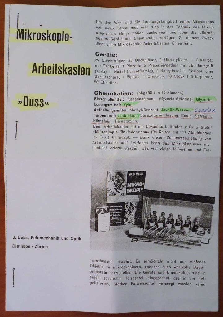 Ich konnte vor einiger Zeit einen solchen Mikroskopkasten erwerben. Beim Abholen musste ich feststellen, dass er nicht von Kosmos war, sondern von einer Fa. Duss aus Dietlikon bei Zürich. Leider waren alle Gläser fein säuberlich gereinigt.