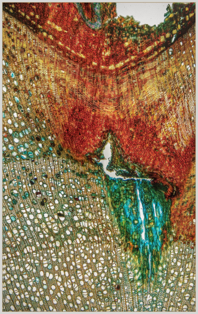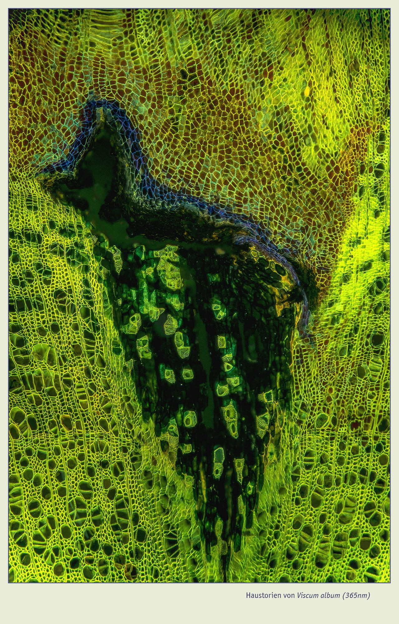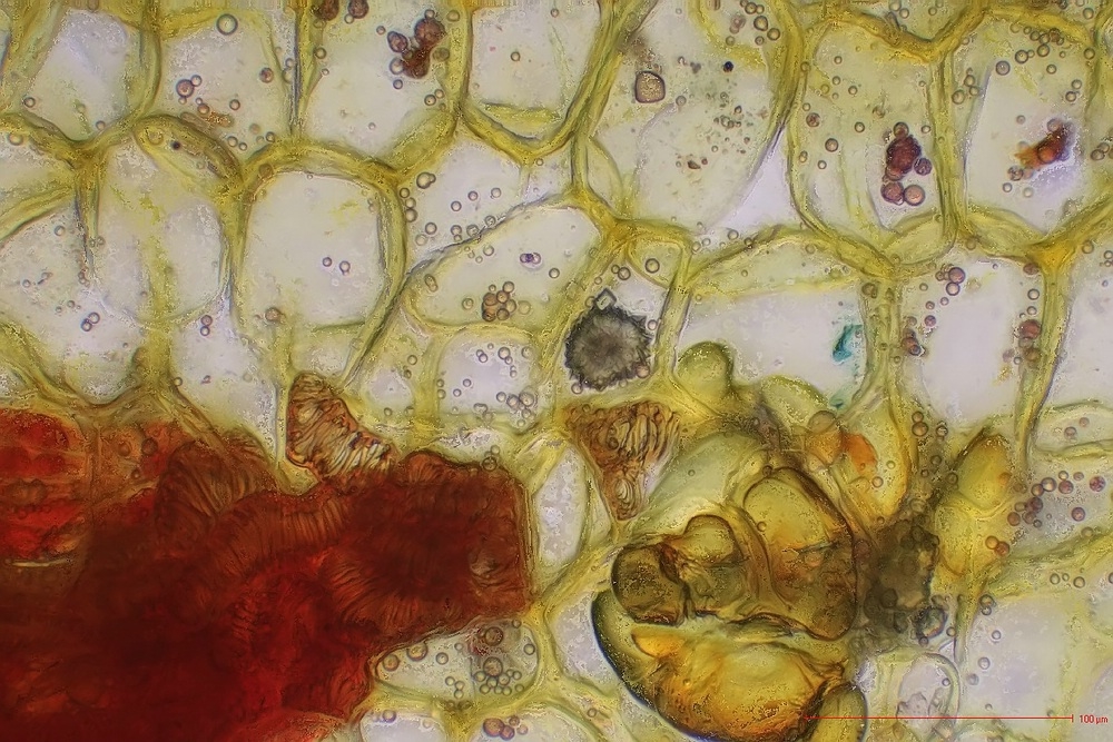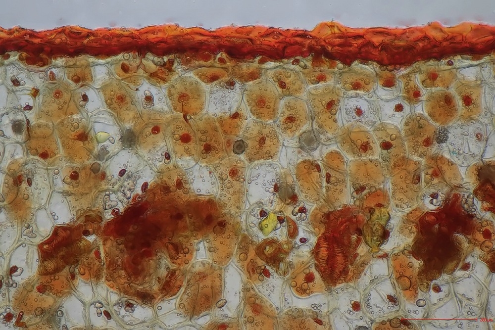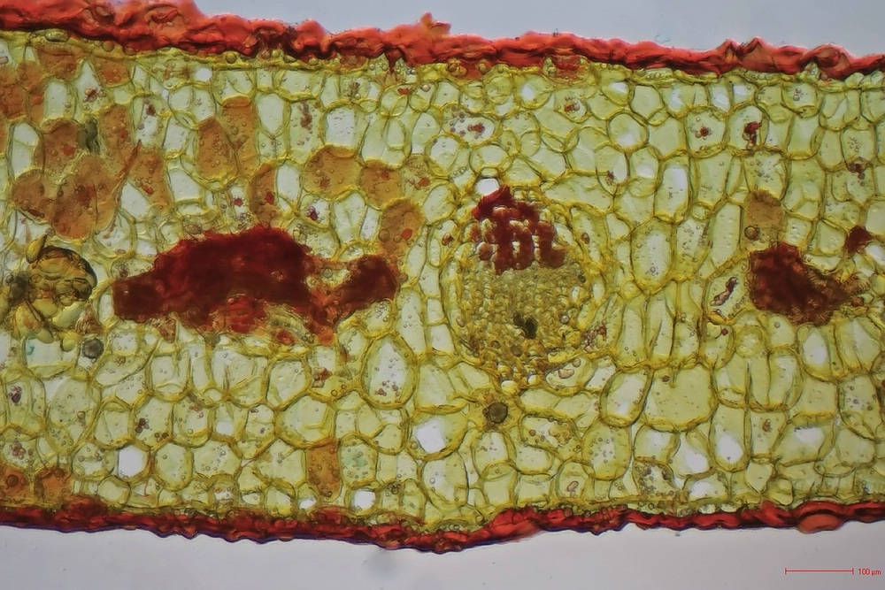 Da die Mistel einiges an Schleim enthält, würd eich vermuten, dass eine kurze Spülung mit Klorix (Blaue Flasche, 1:4 in Aqua dest. oder Eau de Javel :) ) die roten Artefakte rund um die Idioblasten mit den interessanten Zellwänden vermieden hätte. Dabei muss man allerdings aufpassen: bei zu langer Einwirkzeit lösen sich die Gewebe auf.