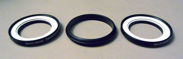 Zwei step up-Ringe 32-42 mm mit Pappringen zum Schutz der Linsen und einen T2 male/male Adapter als Platzhalter. Dazwischen habe ich dann die Linse eingeklemmt und die ganze Baugruppe dann mit einem step down-Ring 42-32 mm an einem T2-Stueck befestigt.