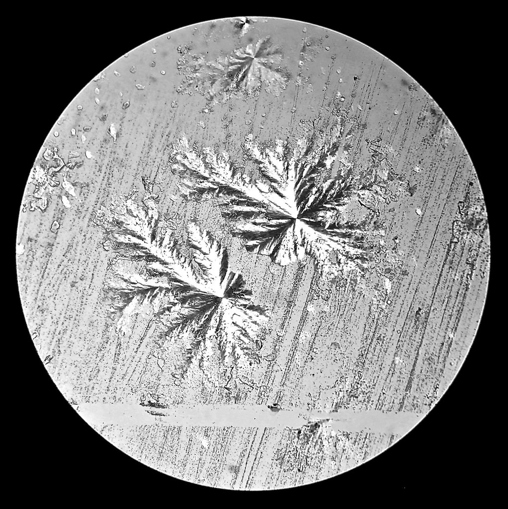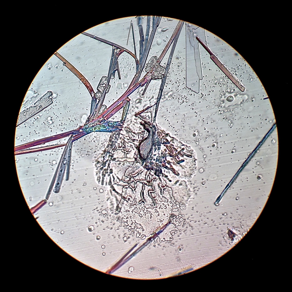 Bei dem Verdunstungspräparat mit Deckglas sind Kristall-Konglomerate und grasartige Kristallstrukturen entstanden.