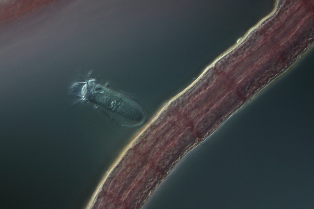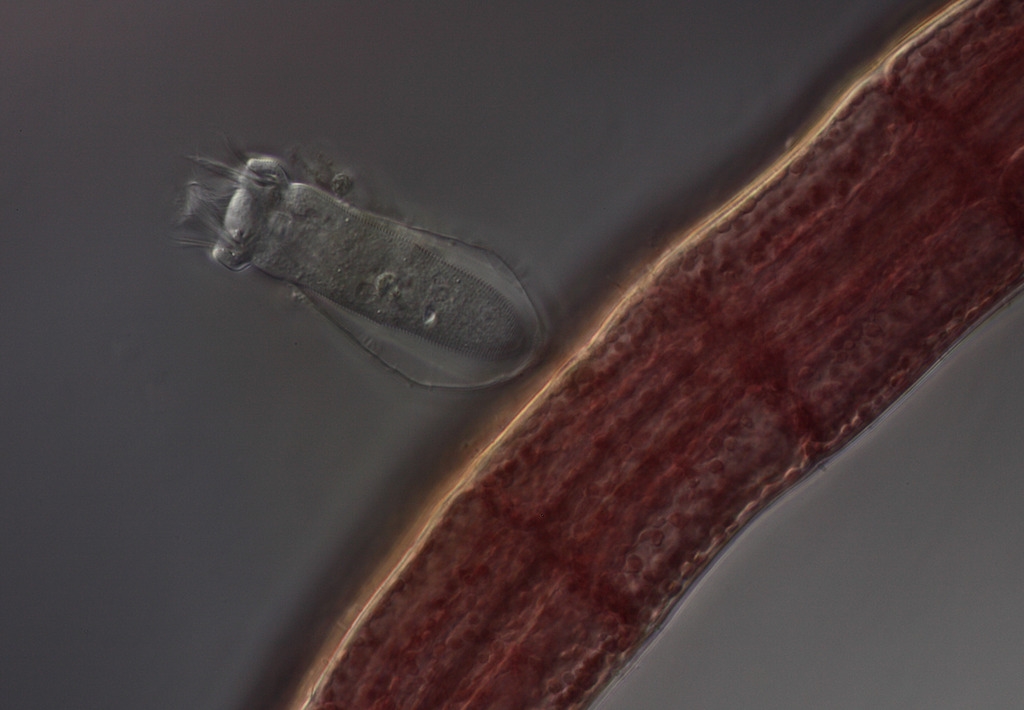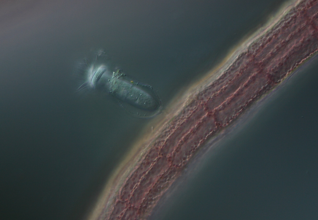 ist ein Rädertierchen. Sind (zumindest im Brackwasser) z.Zt. wohl sehr zahlreich unterwegs, hatte mit dem Planktonnetz vor ca. 2 Wochen ganz viele (aber nichts anderes) gefischt. Schöne Bilder, aber die Bestimmung überlasse ich mal den Spezialisten...