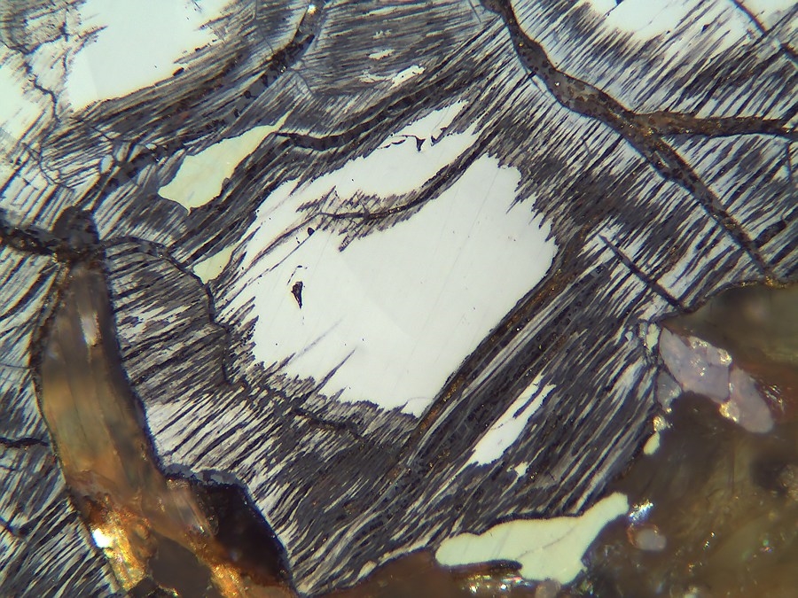 In mein Fund in die Sulitjelma Minen in Norwegen bekomme ich in die Anschliffe immer wieder reichlich das wunderschöne stark anisotrope Pyrrhotite zu sehen aber öfters auch in Situationen die für mich nicht einfach zu verstehen sind.