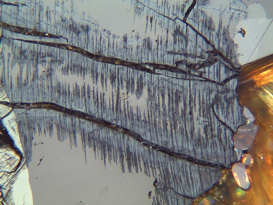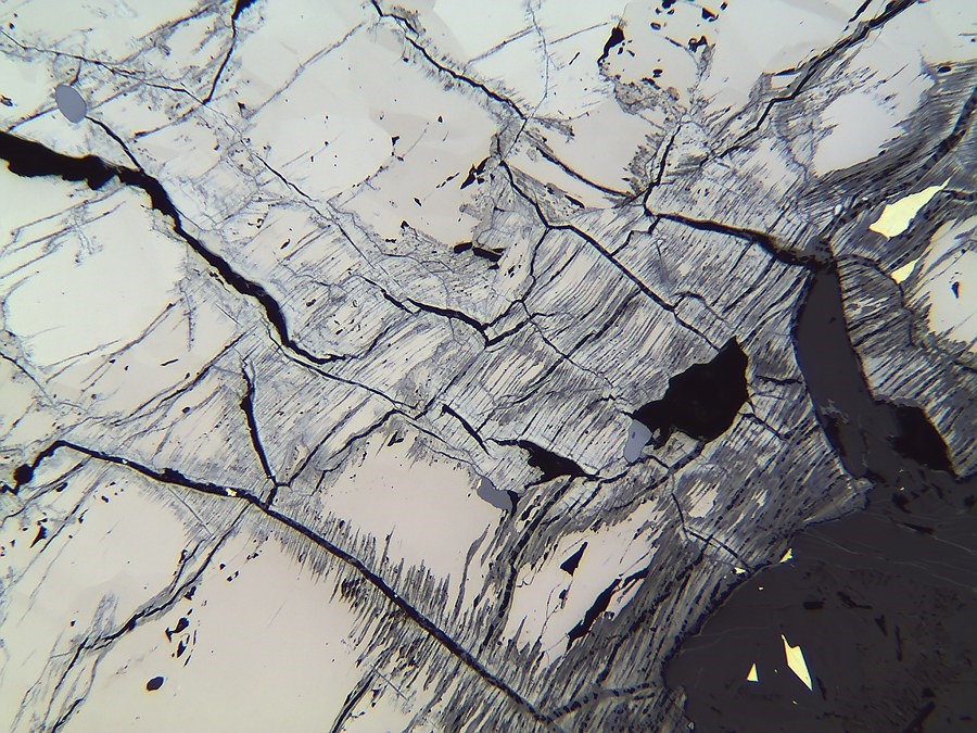 Meine Frage ist dann auch: was sind die Schwarze Strukturen die meist senkrecht an die Korngrenzen entstehen? Sieht man hier eine Frühstadium von eine Verdrängung, Martitisierung oder ist das Pyrrhotite verwittert?