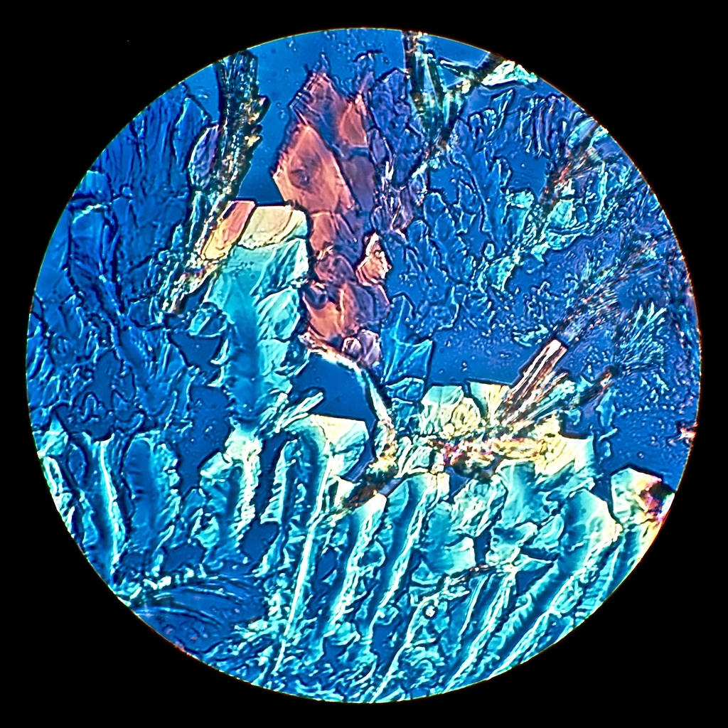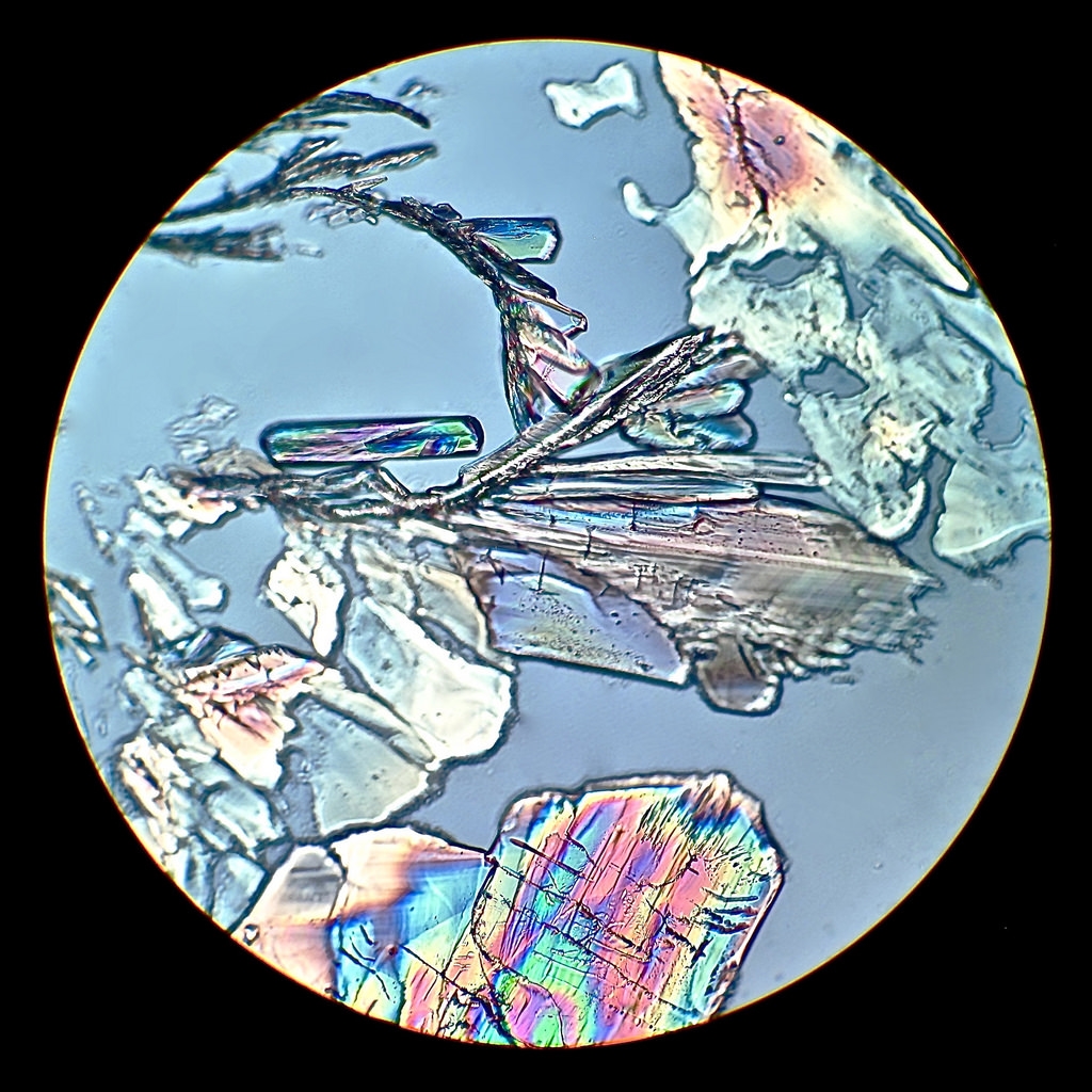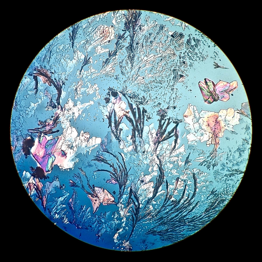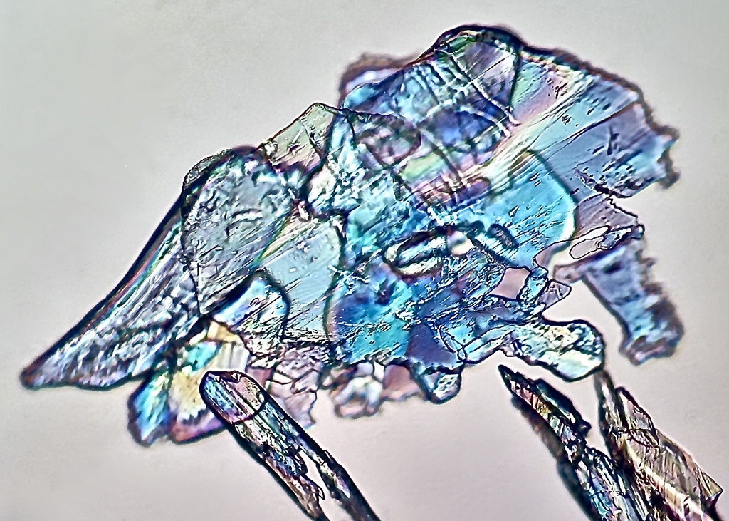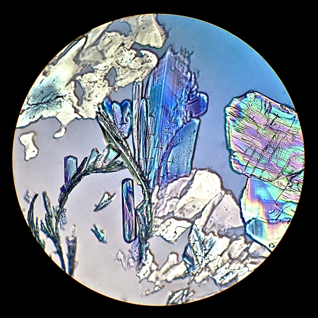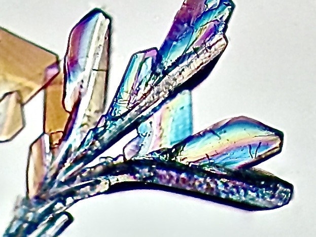 Abschließend zeige ich noch 5 Mikrofotos der sehr unterschiedlichen Kristallstrukturen von dem Verdunstungspräparat mit Deckglas.