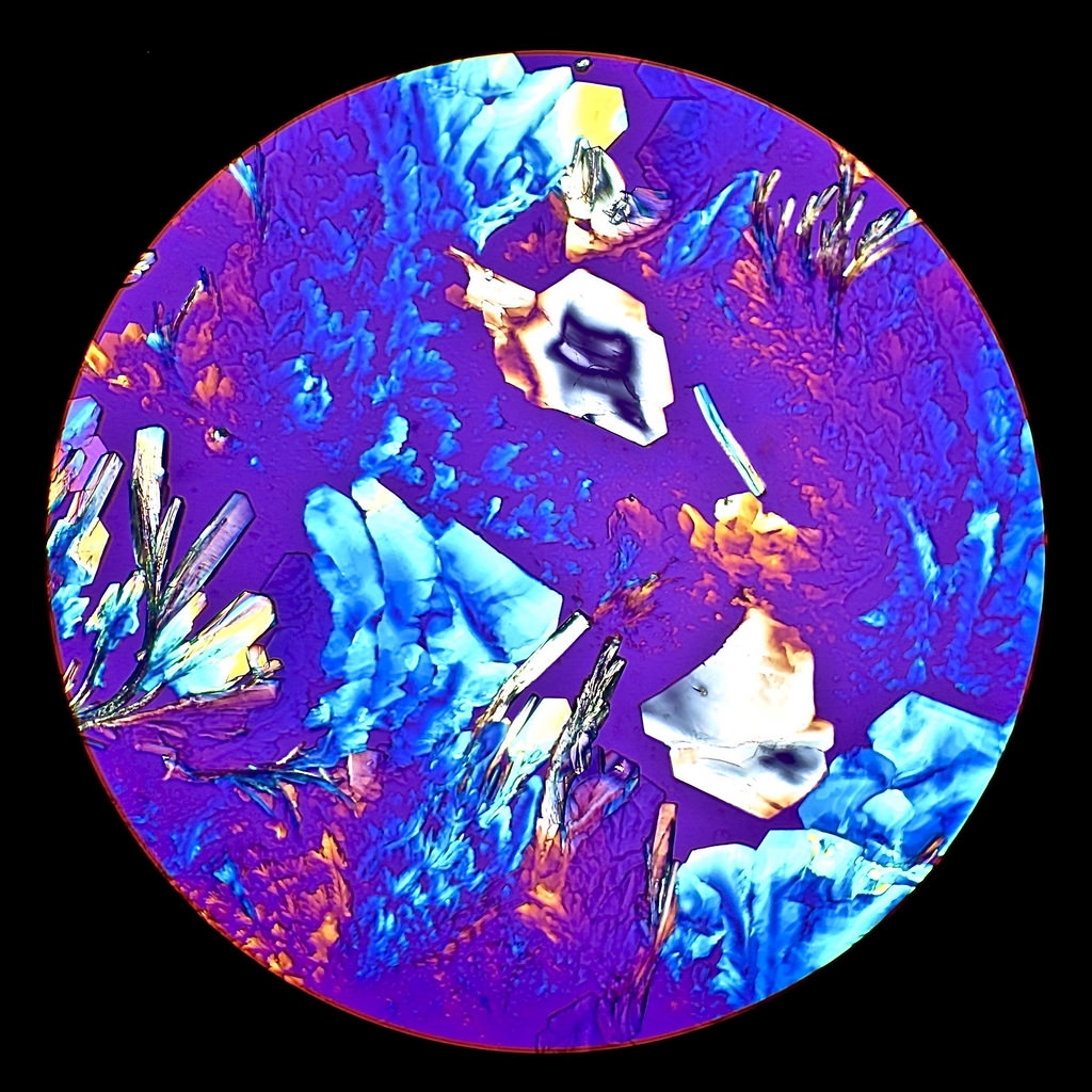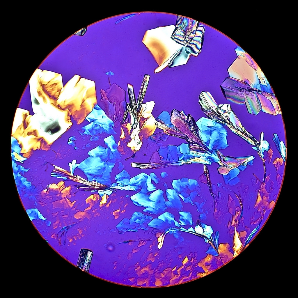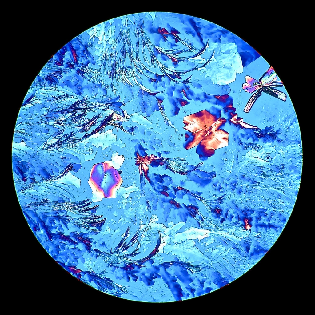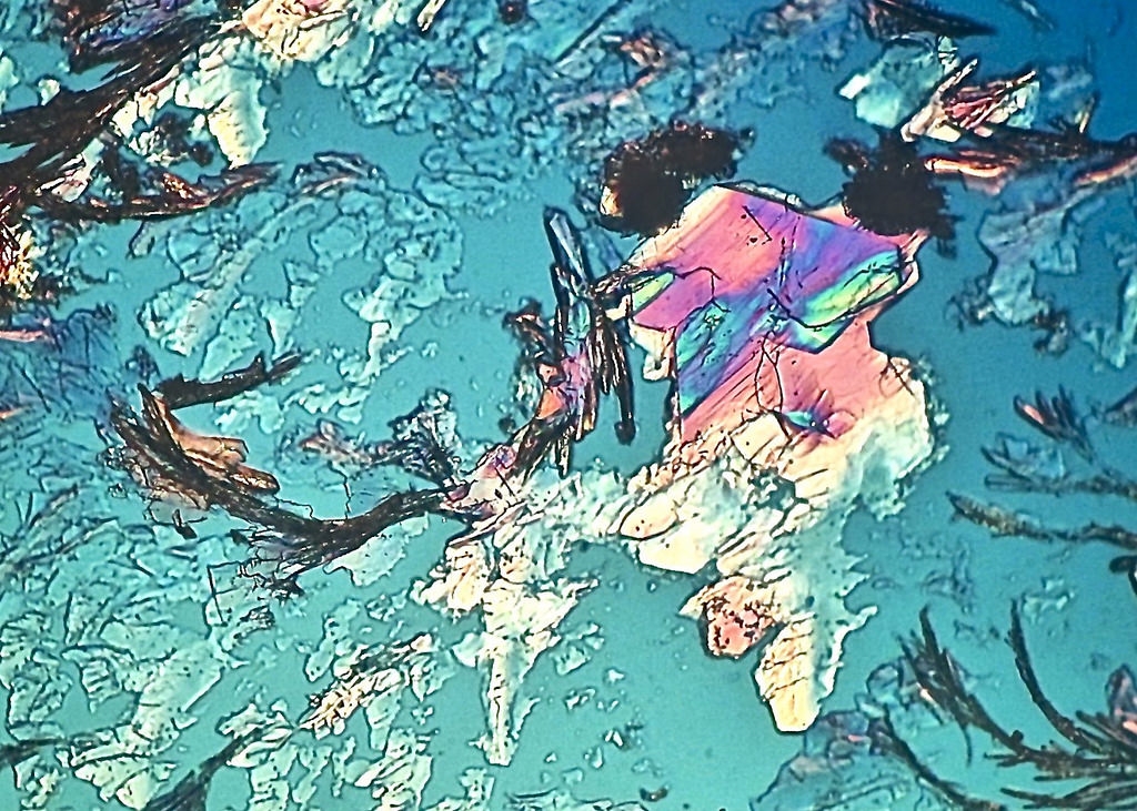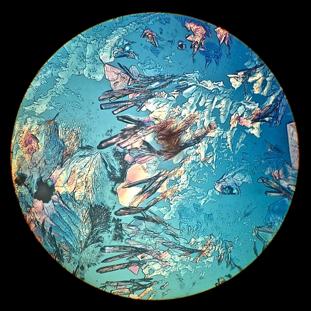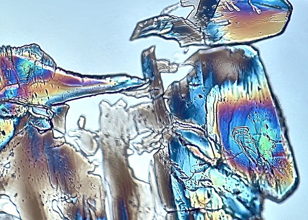 Abschließend zeige ich noch 5 Mikrofotos der sehr unterschiedlichen Kristallstrukturen von dem Verdunstungspräparat mit Deckglas.