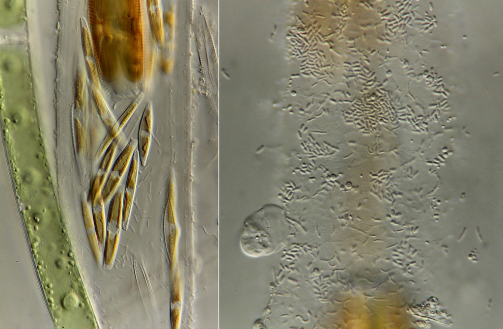 vielleicht kann jemand der hier im Forum aktiven Diatomeen-Experten Hintergrundinformationen zu einem interessanten Phänomen beisteuern, das ich bei der Untersuchung von Diatomeen-Proben aus dem Main in den letzten Tagen beobachten konnte? Im Tümpler-Forum habe ich über zwei Diatomeen berichtet (Cymbella cf. prostrata und eine Nitzschia-Art), die gemeinsam in gallertigen Schläuchen leben (siehe http://www.mikro-tuemplerforum.at/viewtopic.php?f=25&t=555). Die relevanten Abbildungen füge ich auch hier nochmal ein.
