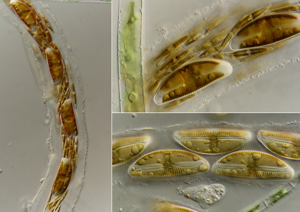 Mich würde interessieren, ob jemand ähnliche Beobachtungen gemacht hat (eine oder gar unterschiedliche Diatomeen in gallertigen Schläuchen) und ob es hierzu Literatur gibt? Ich finde nur Informationsschnipsel im Internet, würde aber gerne wissen, ob diese Lebensweise benthischer Diatomeen jemals genauer untersucht wurde.