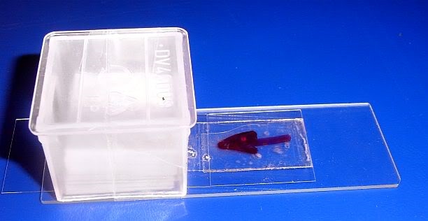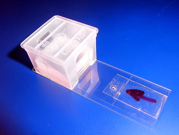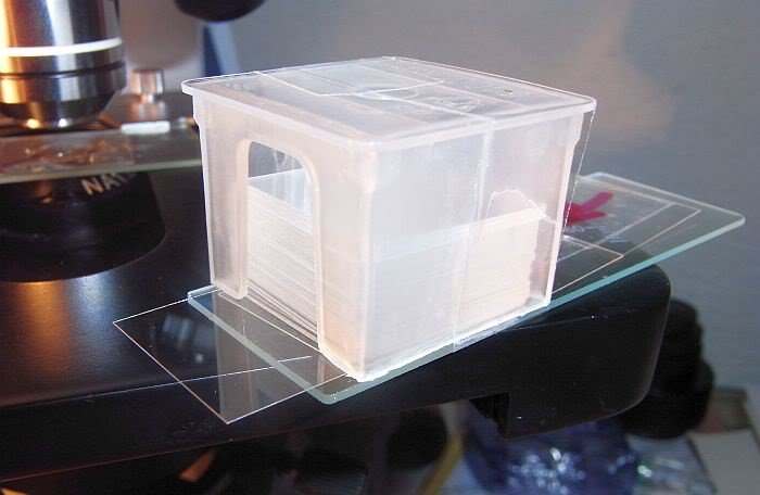 Allerdings: man muss vorher die Innenkante des Plastikkästchens, da wo die Deckgläschen drunter rausgleiten und die Außenkante des Plastikkästchens, da wo die "Schiebedeckgläschen" mit dem Pfeil reinrutschen etwas mit einem Skalpell abschrägen.