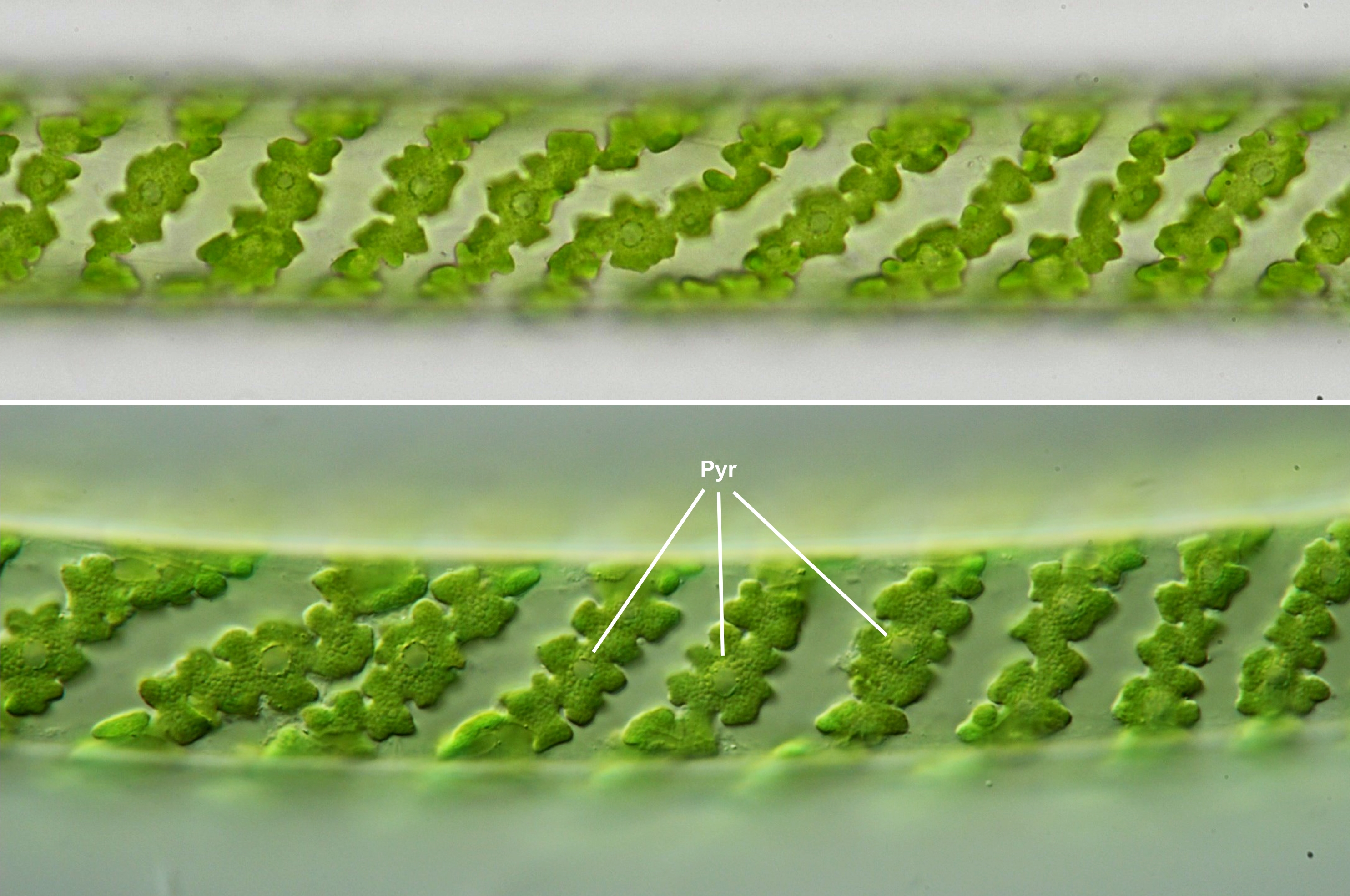 Die folgenden zwei Bilder zeigen das Band des Chloroplasten in höherer Vergrößerung, einmal im Hellfeld, einmal im DIK. Beide Verfahren machen die Pyrenoide ("Stärkeherde") sichtbar (Pyr=Pyrenoid).