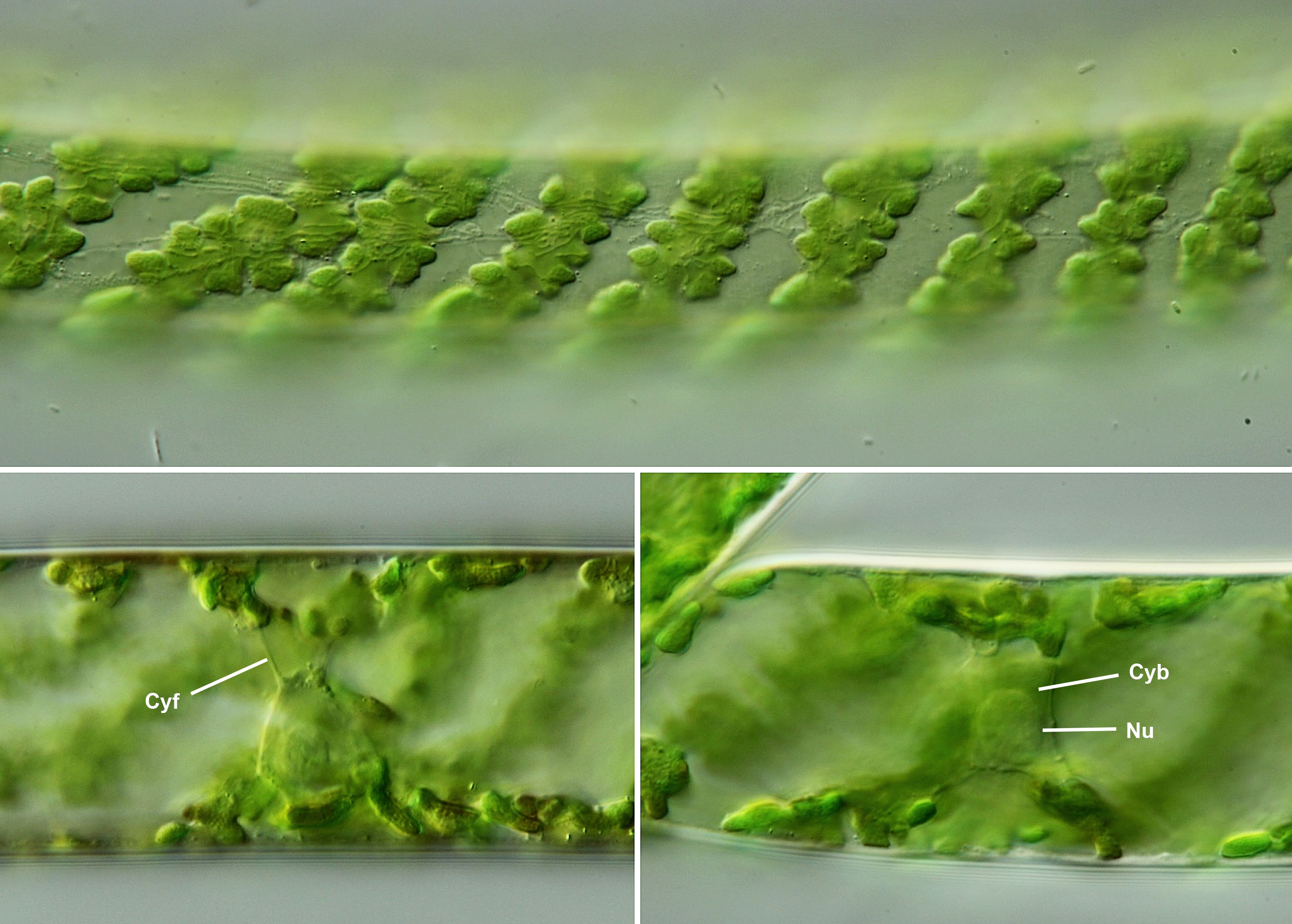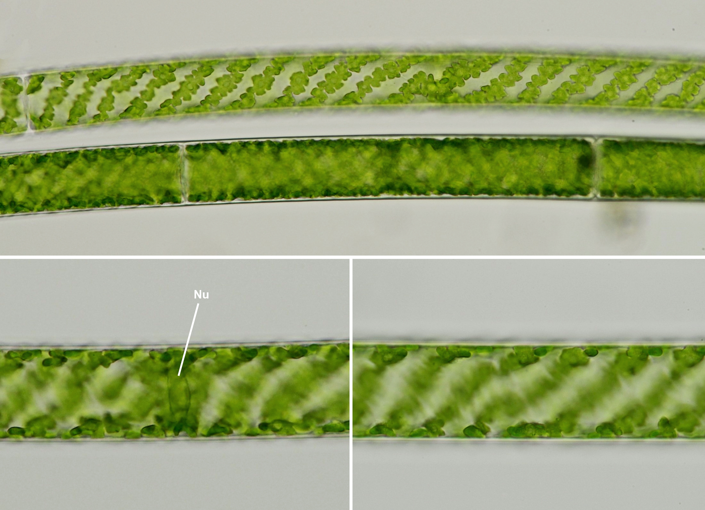 Bei den meisten Zellen des Fadens ist in einer zytoplasmatischen Brücke der Zellkern sichtbar, und eingestreut in das Band des Chloroplasten kann man Pyrenoide, also die Orte, an denen die Assimilate der Photosynthese abgelagert werden, beobachten.