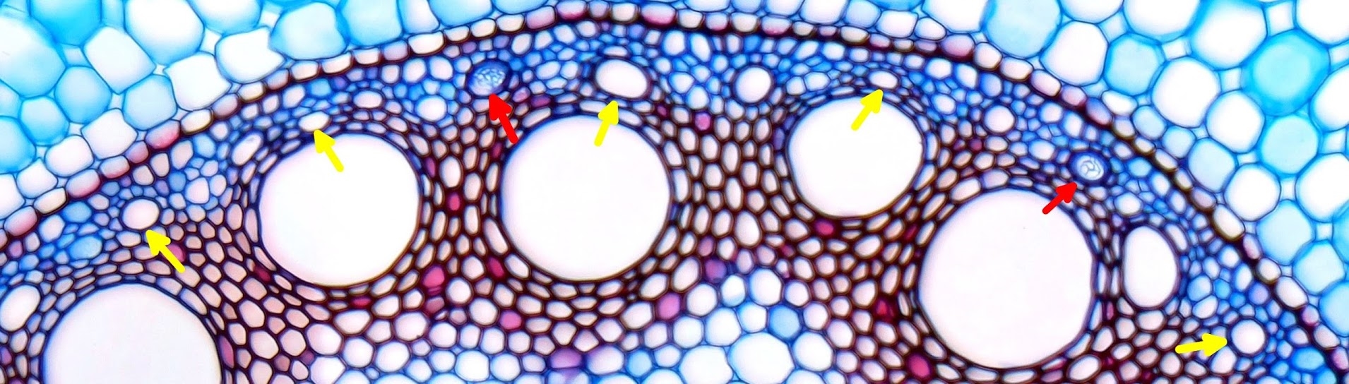 die mit Pfeilen markierten Elemente gehören zum Xylem. Die Phloem-Gewebe befinden sich zwischen den großen Tracheen. Warum sie hier nicht deutlich als solche zu erkennen sind, verstehe ich im Moment nicht.