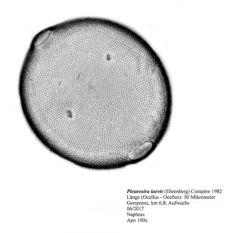 hier zeige ich (wieder mal) eine Kieselalge Pleurosira laevis aus dem Unterlauf der Gersprenz bei Stockstadt. Durch den mangelnden Regen und die an dem Flüßchen liegenden Kläranlagen ist das wenige Wasser recht nährstoffreich.