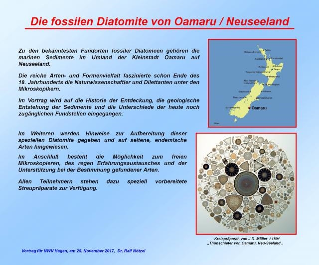 Dr. Ralf Nötzel, den viele von uns als Spezialisten für die Präparation von Diatomeen kennen, wird uns in seinem Vortrag mit den wunderbaren fossilen Diatomeen von Oamaru (Neuseeland) bekannt machen.