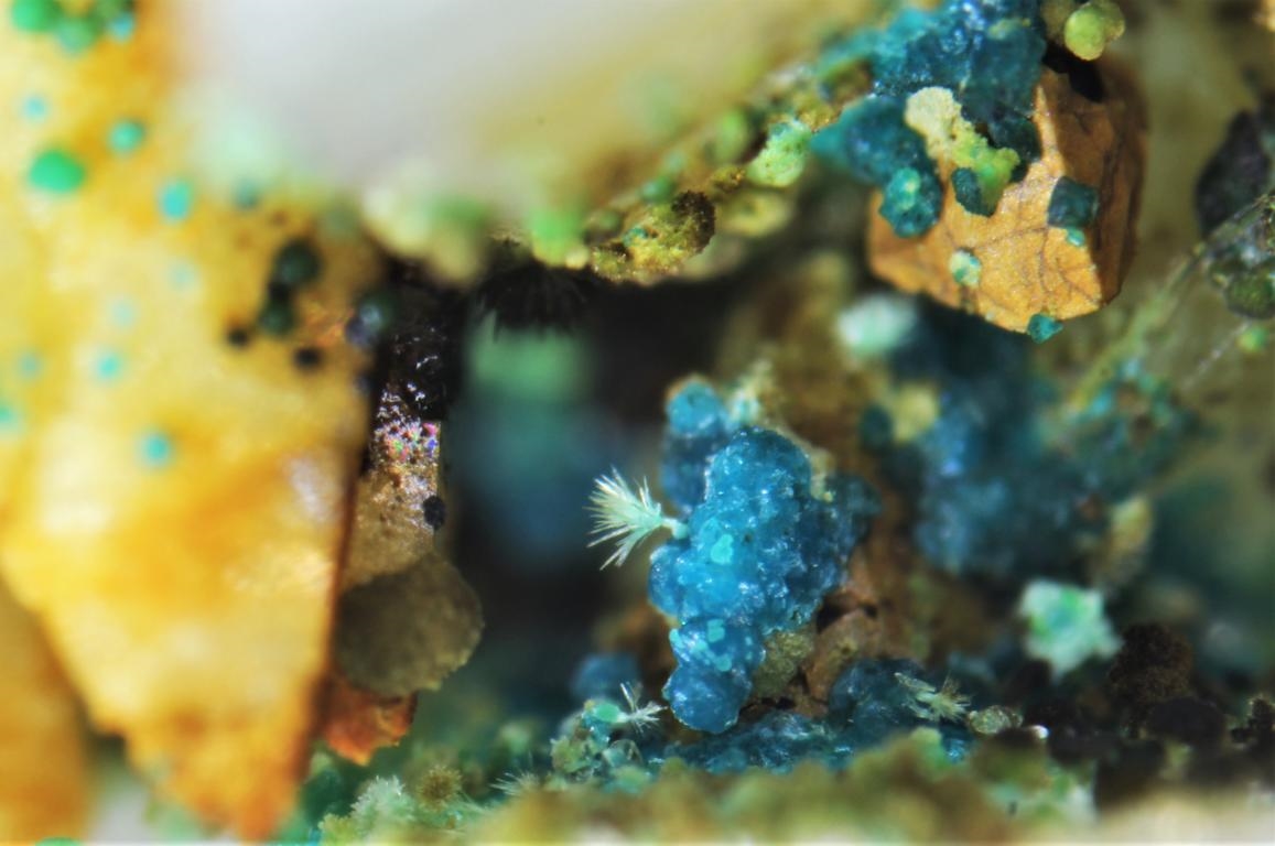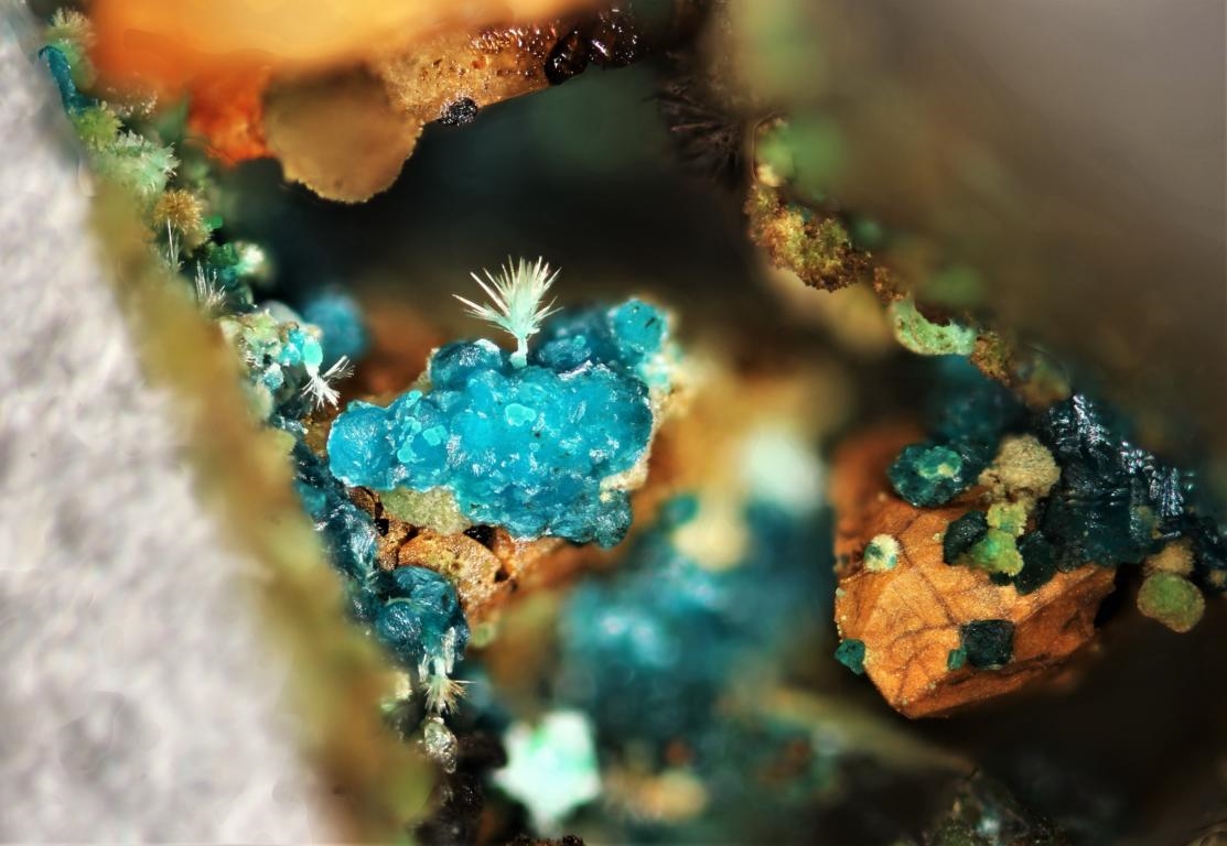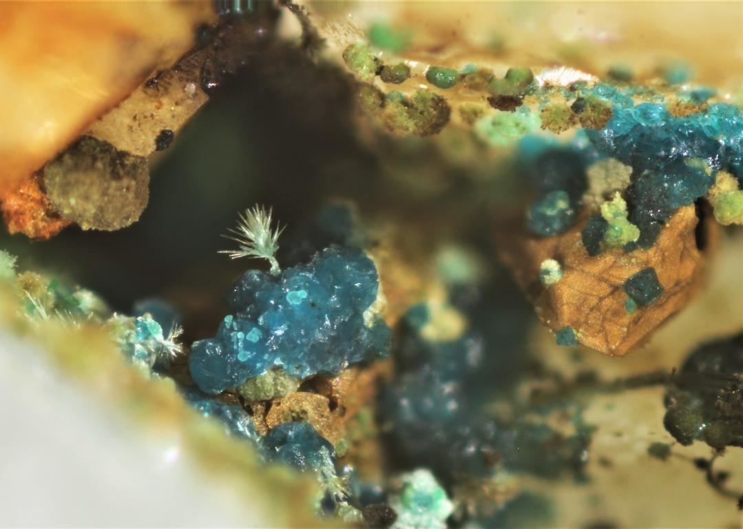 Dazu hat sich Professor Walenta damals nicht äußern wollen, das war ihm nicht wichtig genug. Der Clarait aber doch. Deshalb habe ich das Problem der Bestimmung des Mn nicht, mir genügt seine Aussage. In den vielen Jahren in denen ich Proben der Clara zu ihm brachte, hat er nie bei der ersten Überprüfung eine Aussage gemacht und oft habe ich Monate auf das Ergebnis gewartet, aber dann war ich sicher, dass die Bestimmung stimmt. Sein Spruch war: grün auf der Clara ist immer unsicher, außer manchmal bei Olivenit. Also Mixit, Auricalcit Agardit, Devillin.. oder eher naheliegend: Olivenit. Man hat die Wahl. Aber in diesem Fall kann ich mit der Unsicherheit leben: das kleine "Pälmchen" stelle ich nicht zur Überprüfung zur Verfügung! ;)