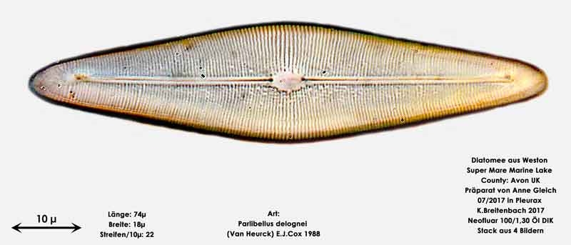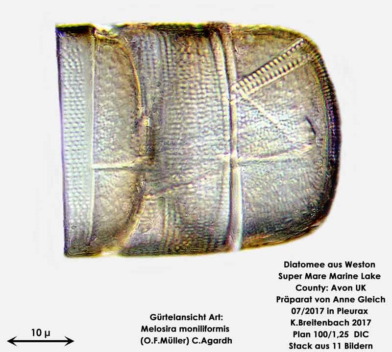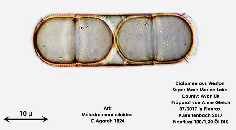 das Präparat stammt aus der Nigel Charles Collection R018: ST 31261902 vom 2.5.1992, aus Weston Super Mare, dem Marin Lake. Entnommen wurden die Proben in der Nähe des Jetty. Damit handelt es sich hier um rezente, marine Diatomeen. Das Präparat wurde erstellt von Anne.