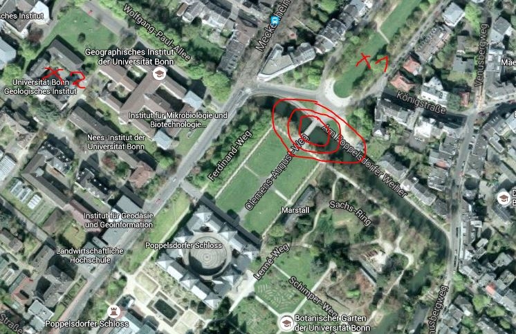 Treffpunkt ist die eingekreiste Brücke. X1 ist die Poppelsdorfer Allee und X2 das Steinmanninstitut.).