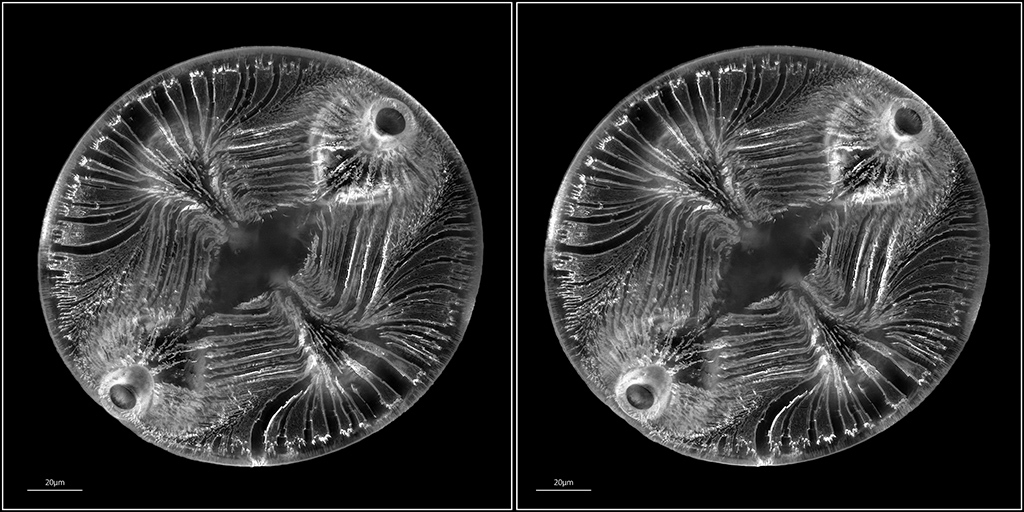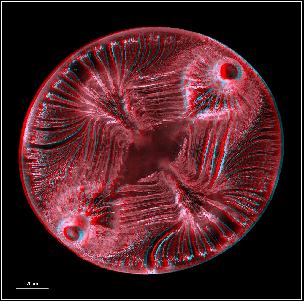 Vor gar nicht allzu  langem hatte ich schon eine Aufnahme von Auliscus Oamaruensis im Auflicht hier veröffentlicht, diese hier gefällt mir aber noch etwas besser, und ein Stereopärchen habe ich diesmal auch erstellt. Das lohnt sich bei dieser Kieselalge auf jeden Fall. Und da Bernd gerade so ein irres REM-Bild hier gezeigt hat, ist der lichtmikroskopische Vergleich sicher auch ganz interessant.