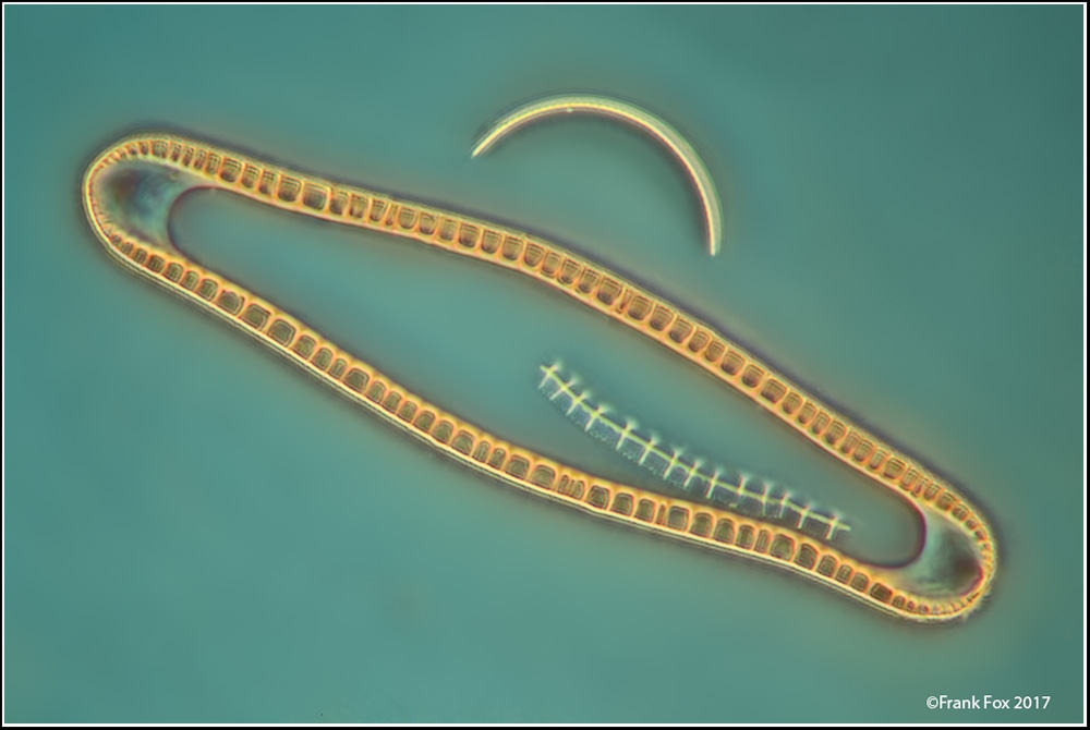 Mich fasziniert die zweite Diatomee. Ich meine, die auch recht häufig im Watt-Schlick aus Sylt gefunden zu haben, und zwar in der hier gezeigten ,,Seitenlage" als auch ,,aufrecht". Da sieht sie rund aus. Kann das sein? Wäre schön, wenn jemand die bestimmen könnte.
