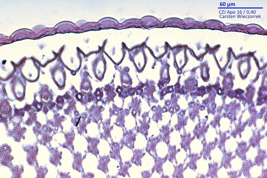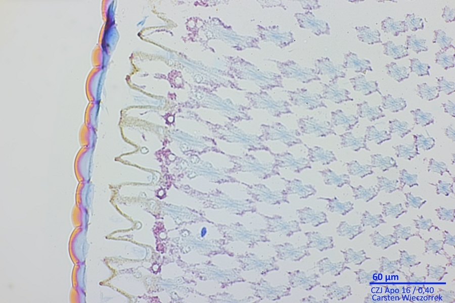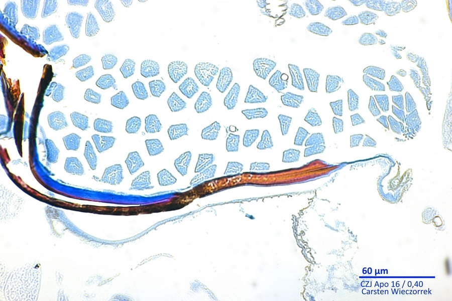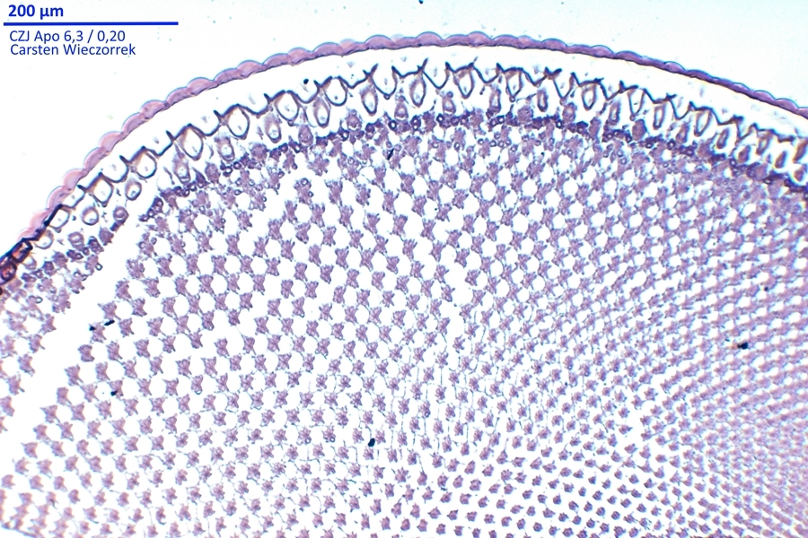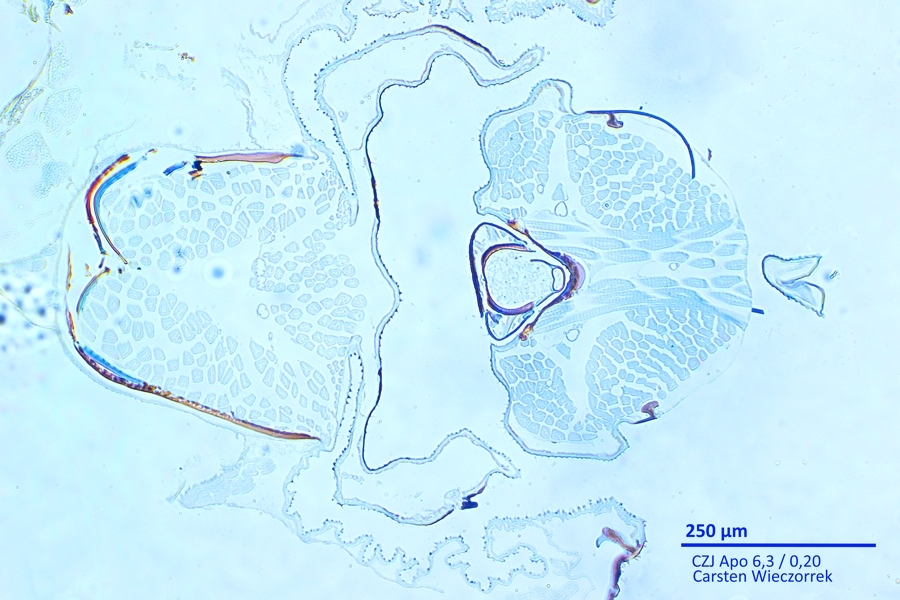 da ich das schnippeln von Insekten auch demnächst probieren möchte, finde ich Deinen Beitrag sehr inspirierend. Ist das Dein erster Versuch dieser Art? Sieht doch stellenweise schon sehr gut aus. Irgendwie hatte ich abgespeichert, daß Jürgen die Insekten immer in Celloidin schneidet. Ich dachte das Paraffin dringt gar nicht durch das Chitin. Dem ist offensichtlich nicht so!