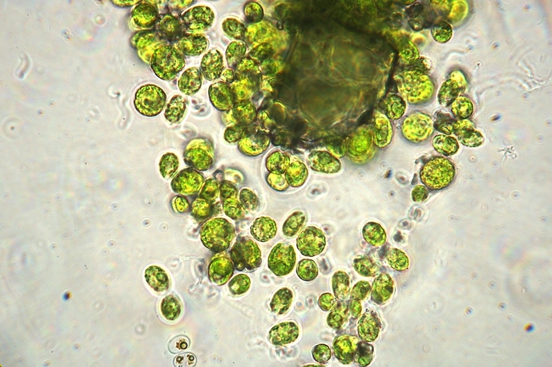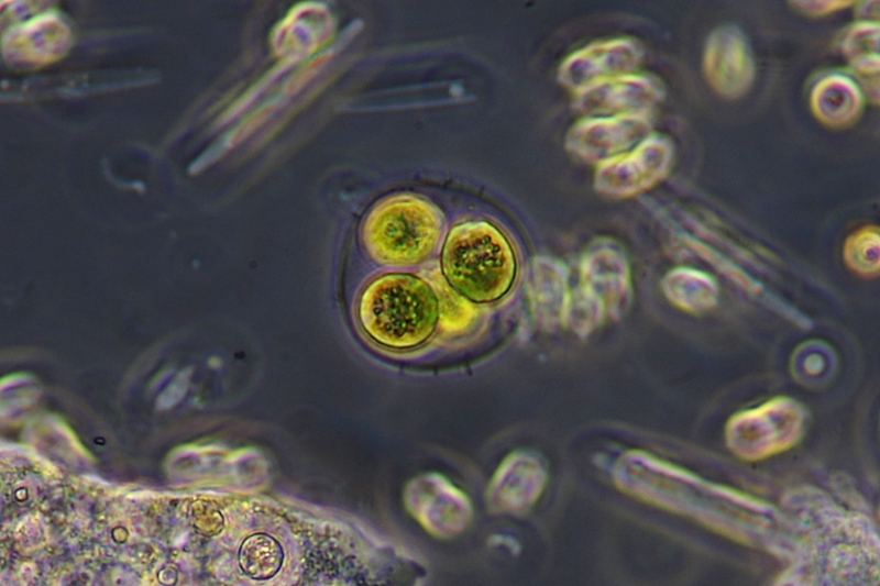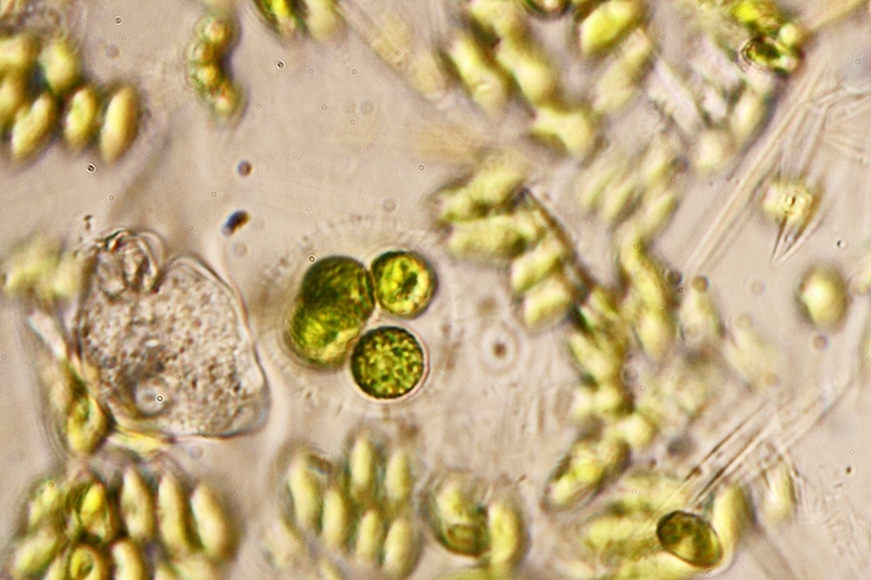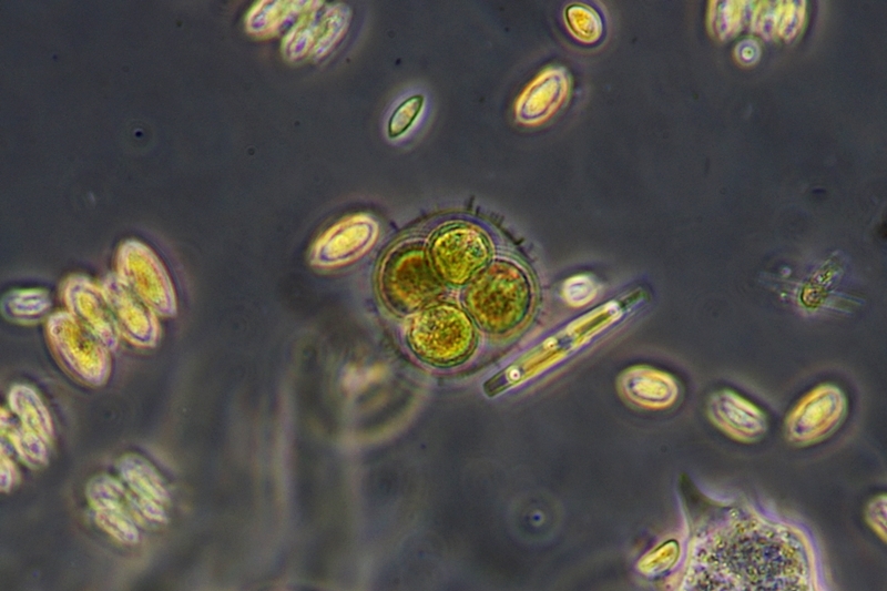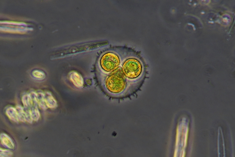 Bei der Algenkolonie im untersten Bild bin ich mir unschlüssig, ob es die gleiche Alge in einem anderen Stadium sein könnte (in der Mitte des Bildes befindet sich auch eine solche mehrzellige Kugel, wie sie auf den anderen Bildern gezeigt wird).