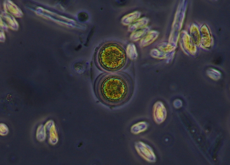 Leider bekomm ich nicht viel bessere Bilder hin. Im Mikroskop kann ich es auch nicht besser sehen als auf den Bildern. Und im Dunkelfeld sieht man von der Hülle wiederum fast nix.