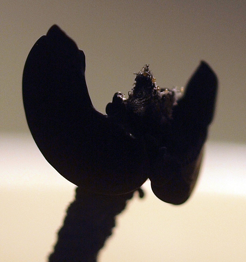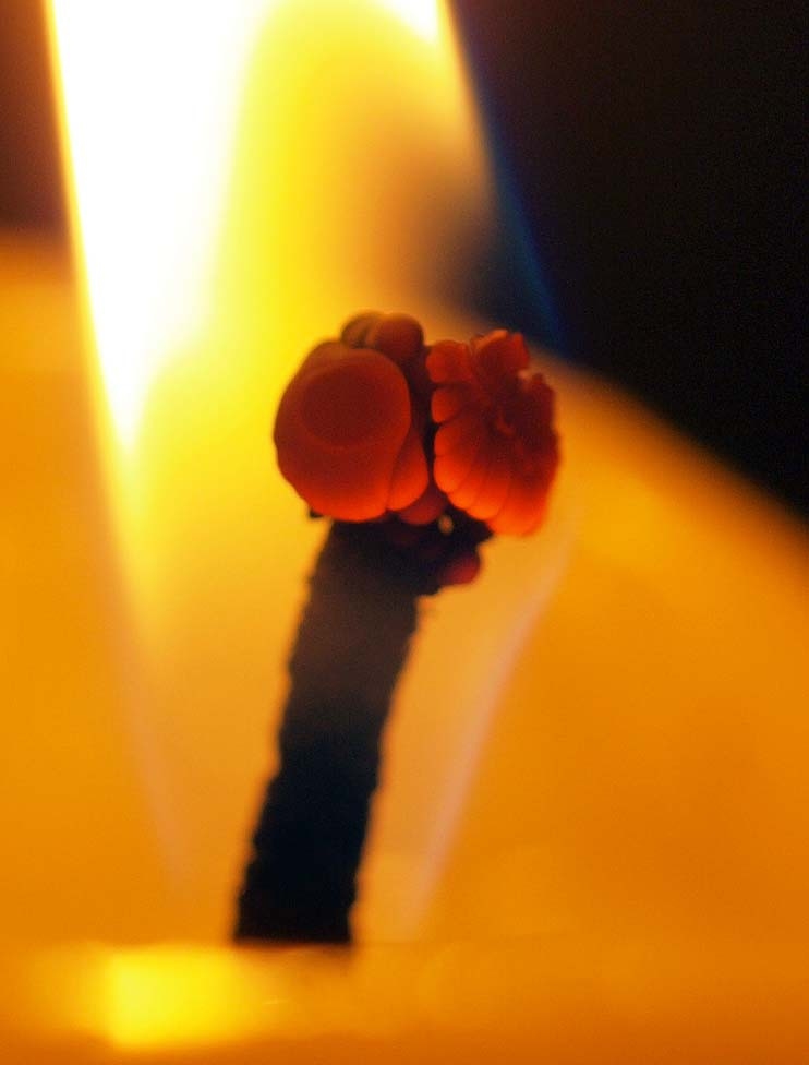 Nach dem ersten Anzünden der Kerze hielt ich die Erscheinung für einen Mangel und schnitt die Dochtspitze mit der Schere ab. Als aber ein ähnliches Gebilde nachwuchs, keimten Zweifel und Gockel mußte ran. Erfolgreich!