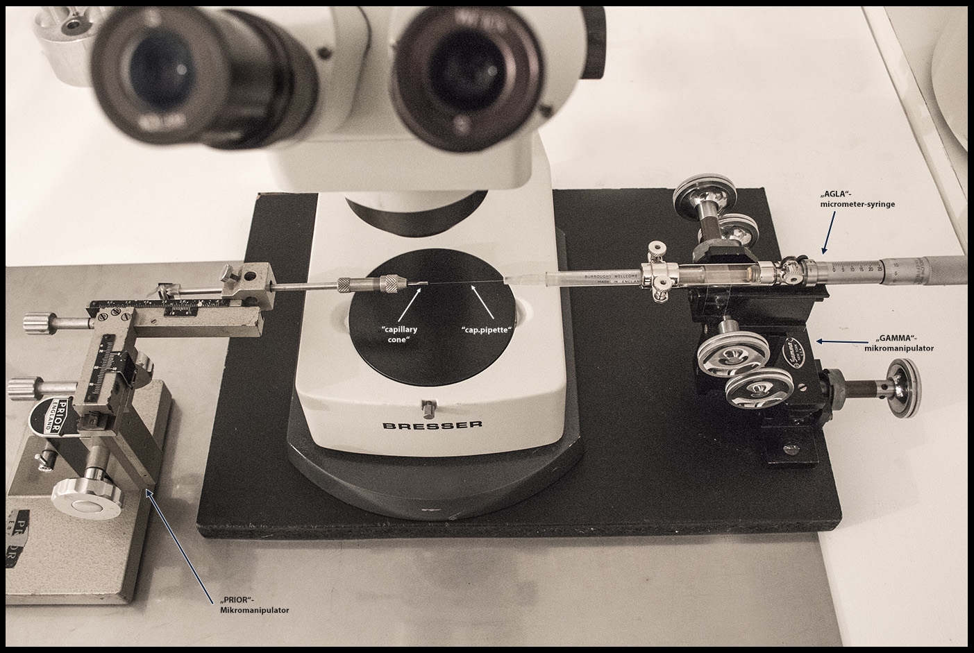 Im Bild 1 ist die (noch nicht vollständige) Manipulator-Anordnung für die Ultramikrochemie (also untere µg-Bereiche und darunter) zu sehen.