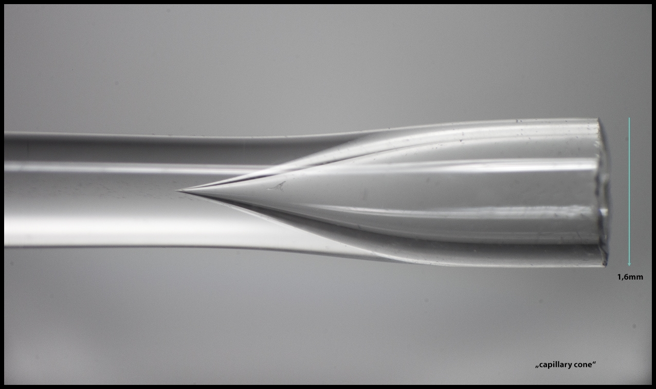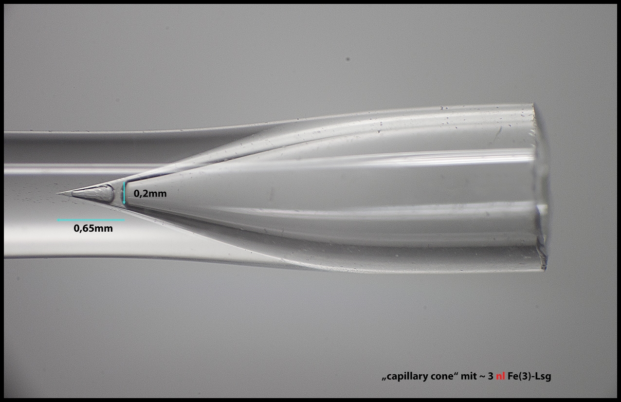 Das Volumen in der Konusspitze beträgt danach etwa 3 nl (Nanoliter)