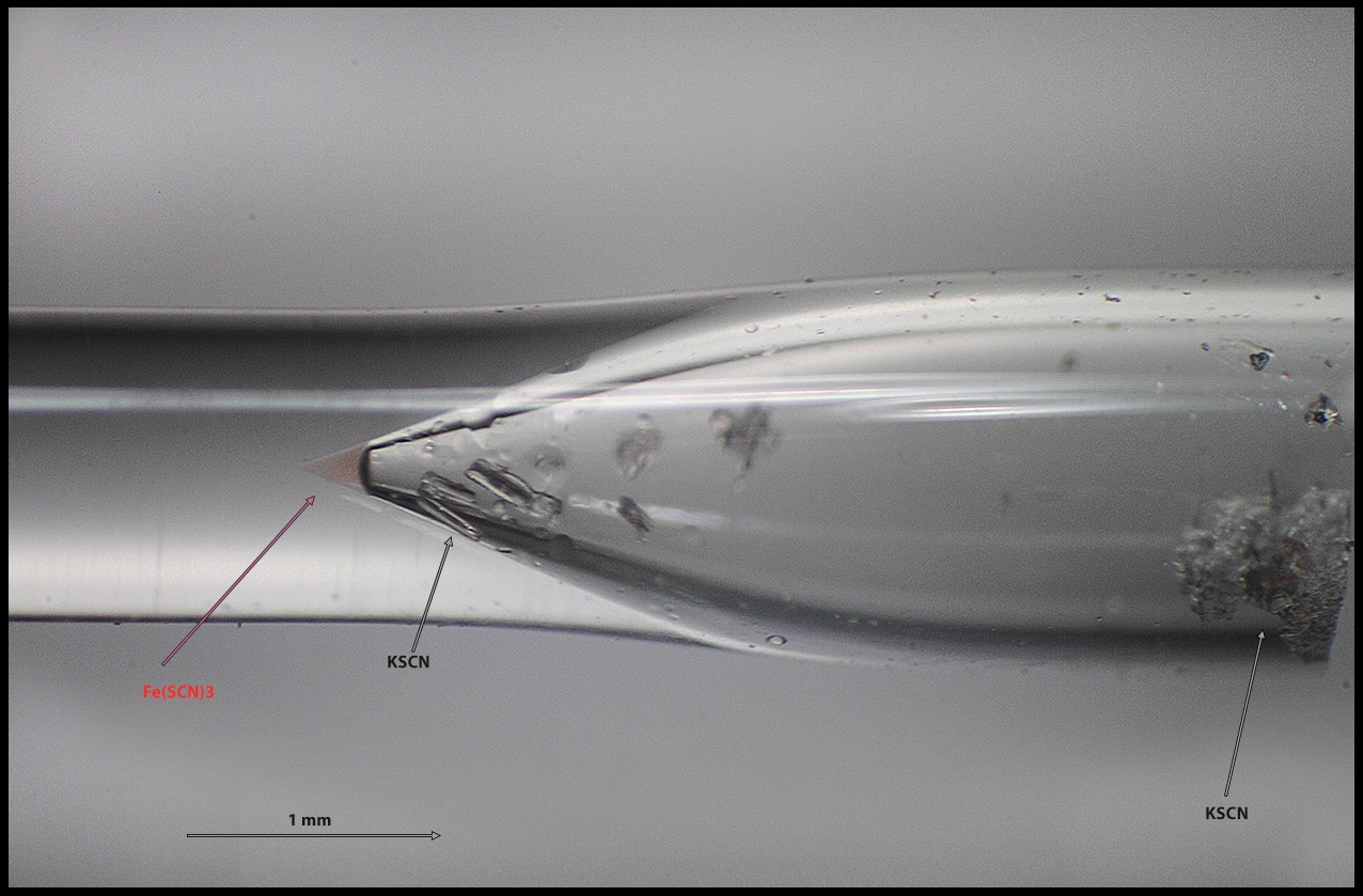 mit einem Glasfaden wurden einige kleine Kristalle KSCN in die Spitze geschoben.
