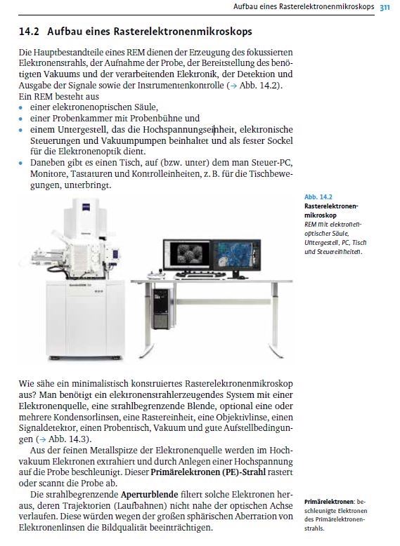 Auf den folgenden Seiten 189 - 259 geht es um die Theorie der mikroskopischen Abbildung /Grundlagen der Wellenoptik, Beugung im Mikroskop, Bildentstehung nach Abbe). Die Seiten 261 - 396 befassen sich mit den elektronenmikroskpischen Verfahren (TEM und REM).