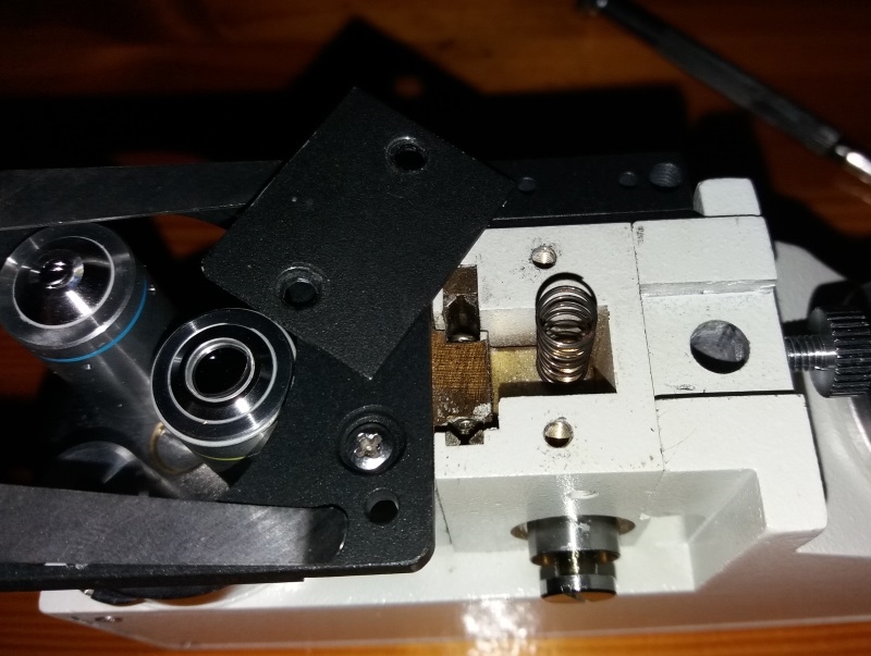 Man kann die Tischführung erkennen, das sind die beiden V-förmigen Nuten mit einem bräunlichen Kunststoff(?)klotz (Tischträger ?) dazwischen, dieser läuft mit irgendwelchen Zapfen oder Kugeln in den Nuten. Schraube mal den schwarzen Tisch an den beiden Kreuzschlitzschrauben ganz ab und studiere dann den Mechanismus der darunter liegt. Wahrscheinlich kann man den Klotz nach oben rausziehen, wenn man irgendeine Sperrschraube entfernt (Vorsicht - vielleicht sitzen in den Nuten lose Kugeln oder Zapfen!). Dann lässt sich auch erkennen, wie die Drehung des Knopfs gegen den Federdruck in die Hebung des Tisches übertragen wird, was wohl über einen Nocken o.ä. geschieht. Das ist aber erst mal geraten.