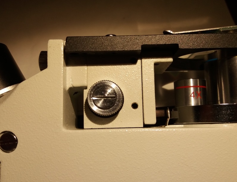 Man kann ihn per Hand nach oben verschieben (und das Präparat scharf betrachten), aber er sinkt danach ungehindert wieder auf die niedrigste Stellung.