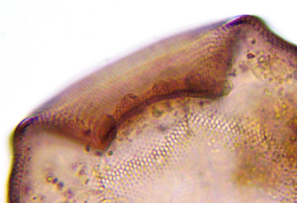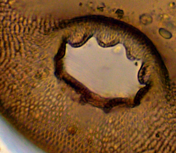 6. Gehäusestruktur von Arcella catinus. Die Wabenstruktur im die Mündung herum habe ich so erkennbar bisher noch nicht gesehen (und Penard auch nicht)