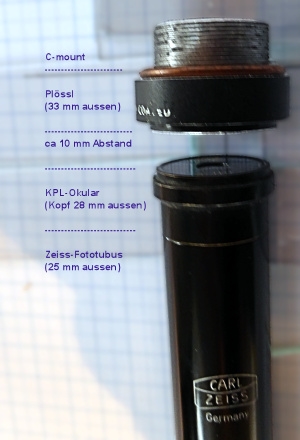 Das Plössl 9mm ins C-Mount Gewinde der Kamera eingeschraubt ergibt Abbild im Unendlich-Bereich. Abstand Plössl zum Okular 5-10mm.
