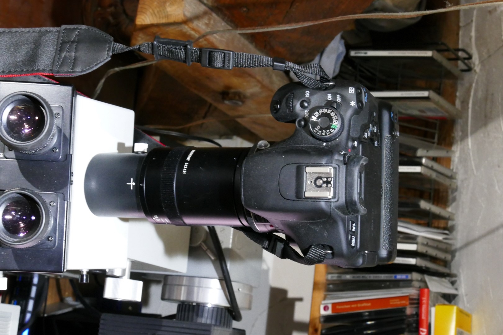 seit langem finde ich mal wieder etwas Zeit, mich meinem Hauptmikroskop zu widmen. (Sorry für die "schiefe" Aufnahme). Am Variookular ist ein Canon 40mm - Objektiv adaptiert. Das Bild im Sucher ist auch knackscharf und panfokal. ABER - mit der Vollformatkamera EOS 5 MK II, kann ich bei Zoomen von einem kreisrunden Bild bei 5.0x bis zu einem an den Rändern leicht vignierten Bild (12.5x) einstellen, erhalte aber kein völlig unbeschnittenes Bild. Nehme ich meine EOS 450D erhalte ich bei 6.3x eine nicht vignettierte Aufnahme. Habe ich bezogen auf das Vollformat hier ggf. eine "falsche" Optik eingerichtet?