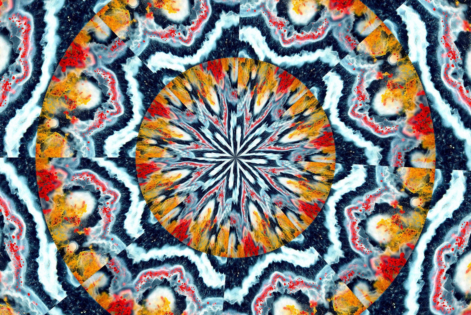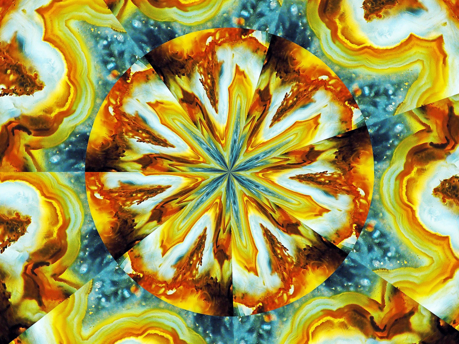das sind eindeutig Mkro- oder Mikroskopaufnahmen, die mit einer Software bearbeitet wurden. Ich erkenne Achate und Seifenhaut-Interverenzfarben.