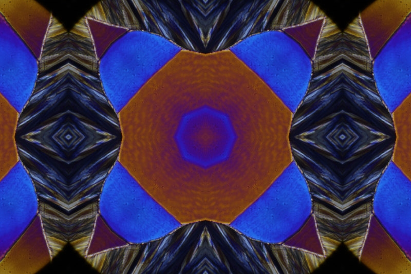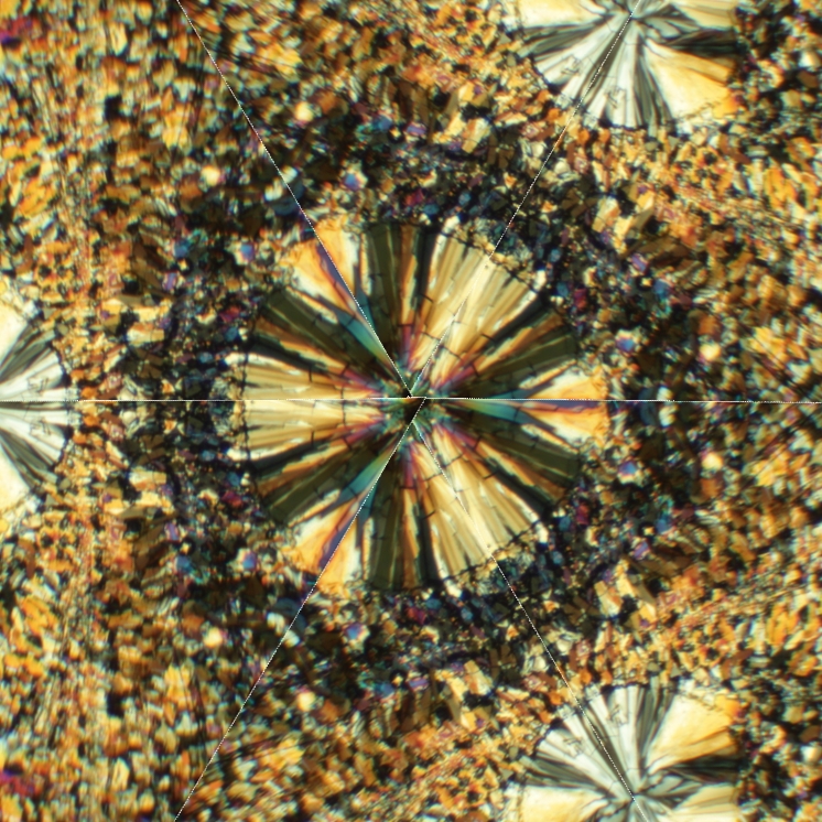 Auswahl eines Gleichseitigen Dreieckes aus einem Bild von Vitamin-C-Kristallen in x-Pol. Dazu habe ich die Ebene 2x dupliziert und diese dann entsprechend gespieglt und gedreht. Daraus habe ich einen "Halbkreis" zusammengesetzt. Die Ebenen wieder verinigt. Diese Ebene noch ein mal dupliziert und vertikal gespiegelt, so dass der Kreis zusammen mit der unteren Ebene sich schloss. Davon ein quadraratisches Bild beschnitten. Beim Ebenen-Zurechtschieben habe ich nicht ganz exakt genug gearbeitet, aber das Prinzip sollte erkennbar sein.