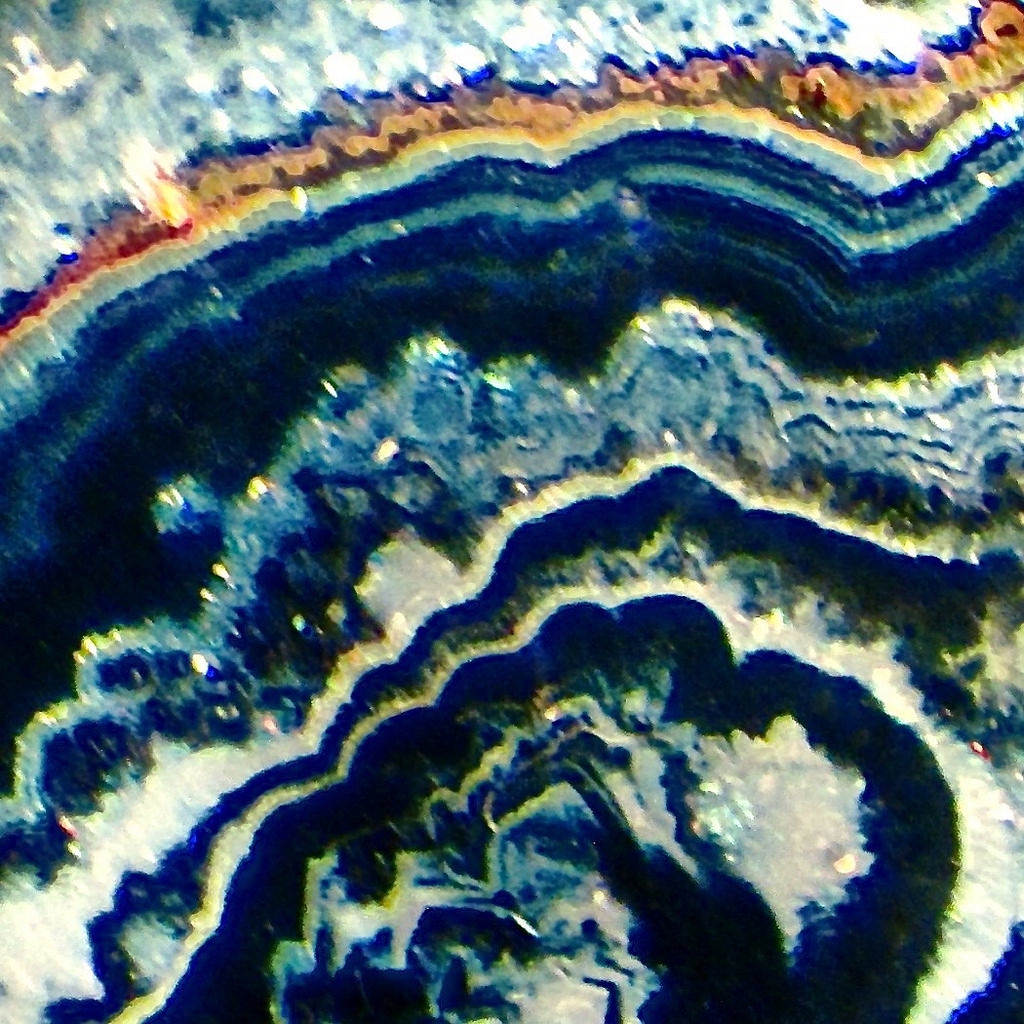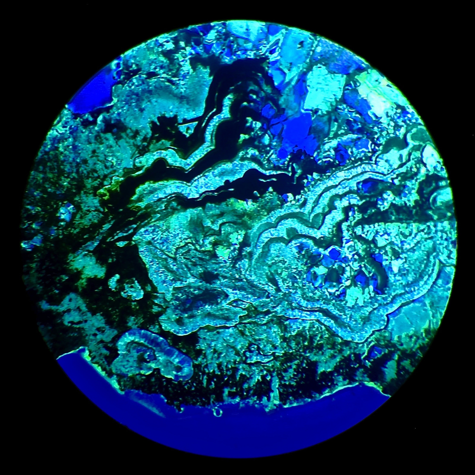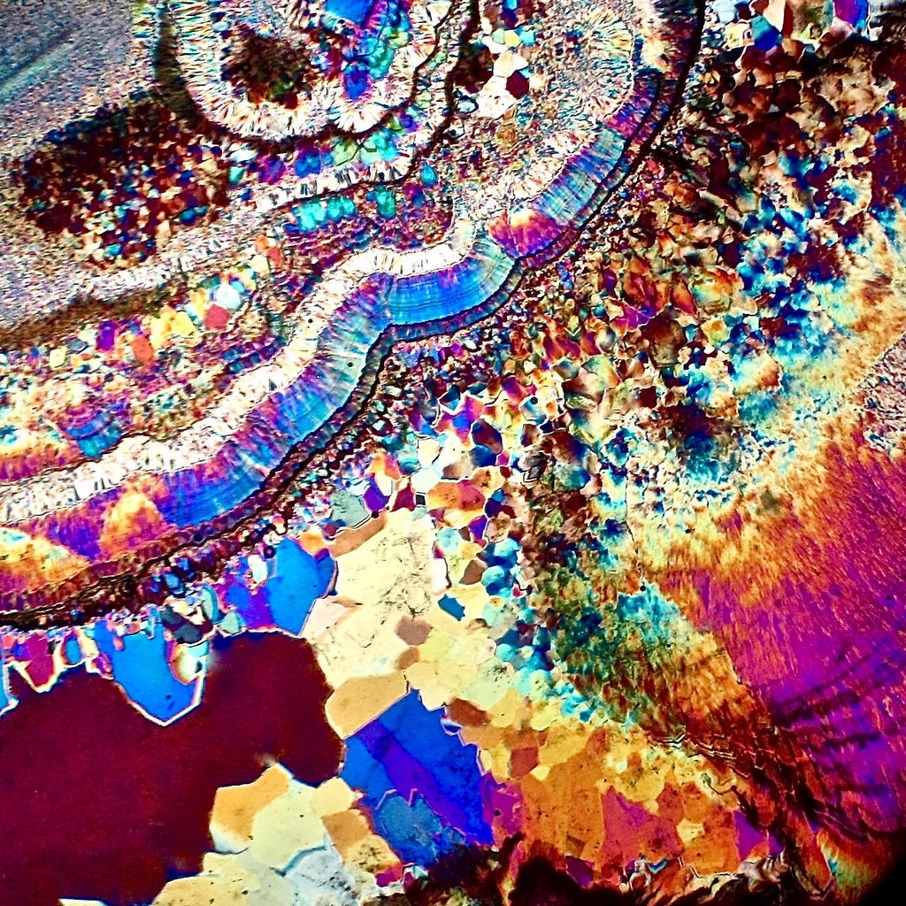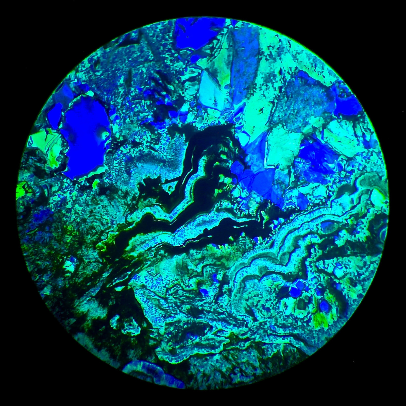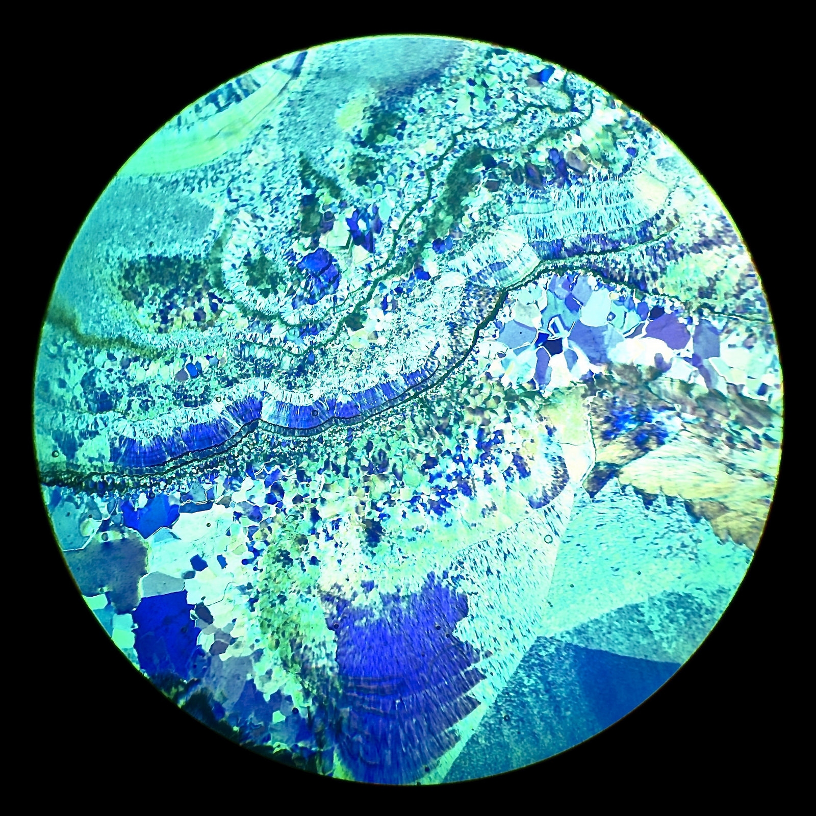 Eine visuell blaue Grundfarbe bleibt auch im Mikrofoto blau. Dabei sind visuell schöne kräftige Polarisationsfarben zu sehen, während auf dem Mikrofoto