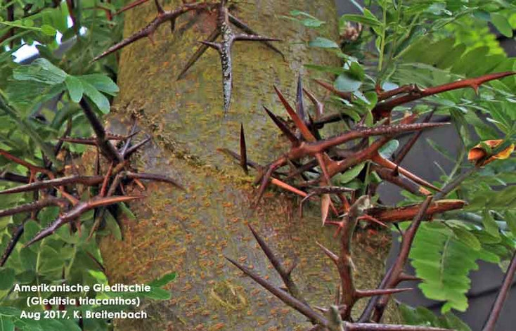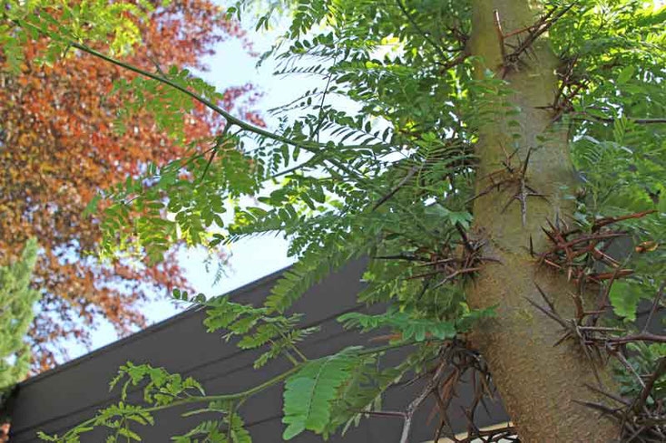 Heute habe ich einen stattlichen Baum in Garten, der sehr stark polarisiert. Meine bessere Hälfte will den schon lange weg haben, denn auf die langen und sehr spitzen Dornen muß man sehr ganau achten bei der Gartenarbeit um den Baum herum. Bisher konnte ich mich aber noch durchsetzen und der Baum blieb und bleibt erhalten. Ich muss ihn zwar jedes Jahr stark zurückschneiden, denn ein weiterer Riesenbaum würde dann doch zuviel Sonne wegnehmen.