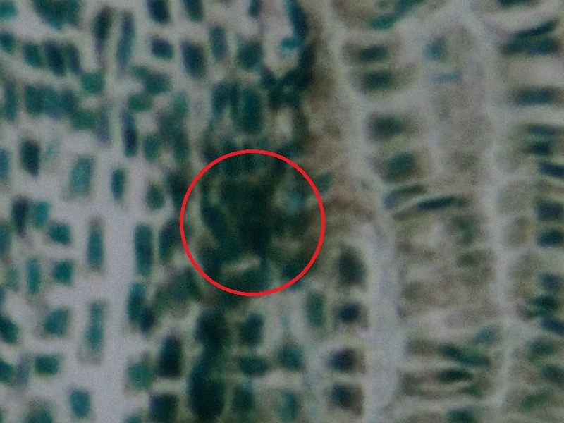 Betrachtet man den im Crop markierten Bereich kann ich da im Mikroskop noch recht scharf Struktur erkennen, auf dem Foto hingegen sind die Grüntöne schon um einiges mehr verwaschen. Auch in der verkleinerten, geschärften Version ist da natürlich nicht mehr als im Crop zu erkennen, woher soll's auch kommen.