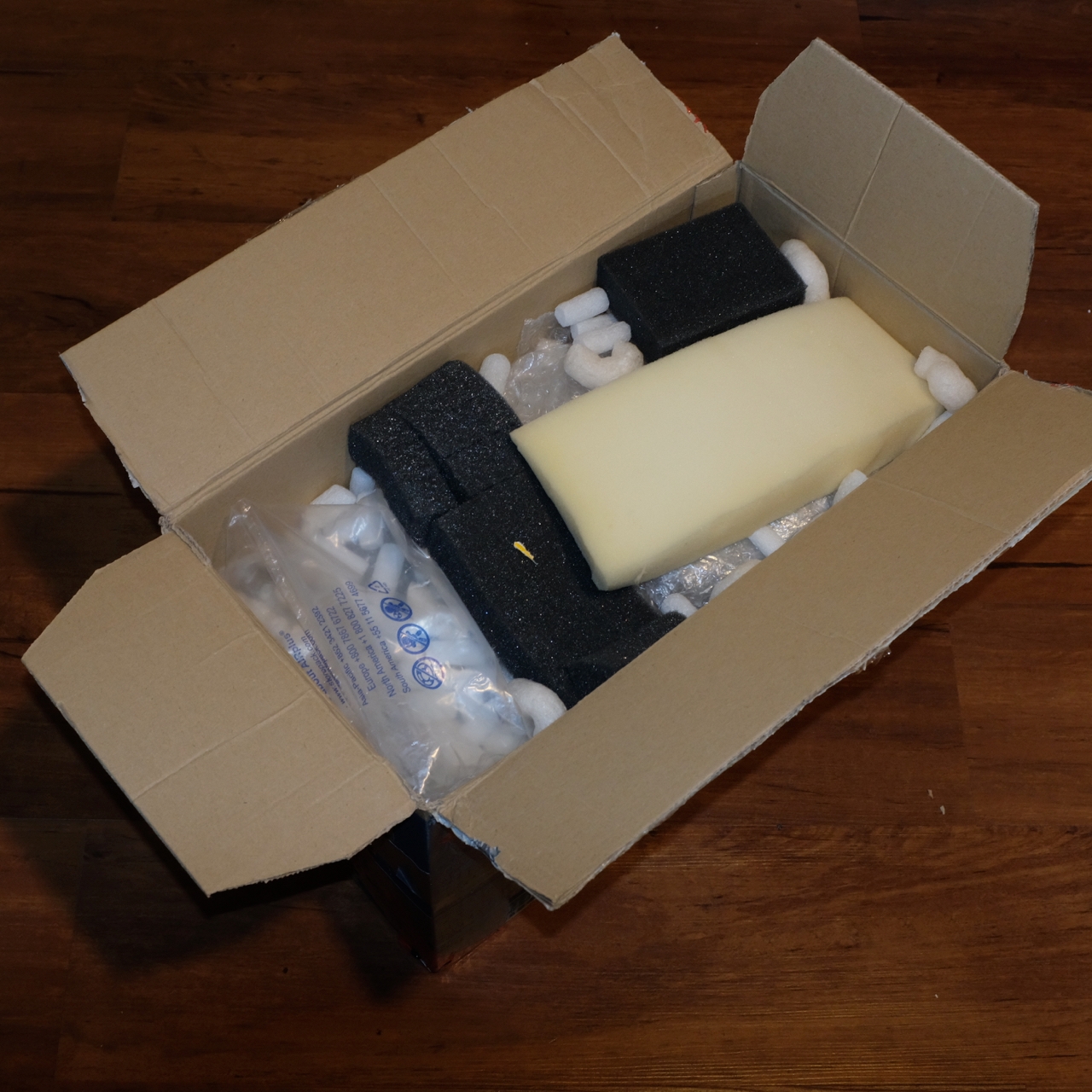 PS: dieses rund 8 Kilogramm schwere Stativ lag – in eine (!) Lage Blasenfolie gekleidet – am ungepolsterten Boden eines ansonsten unvollständig mit Schaumstoff-Abschnitten und Chips beschickten, ziemlich ausgeleierten Karton: