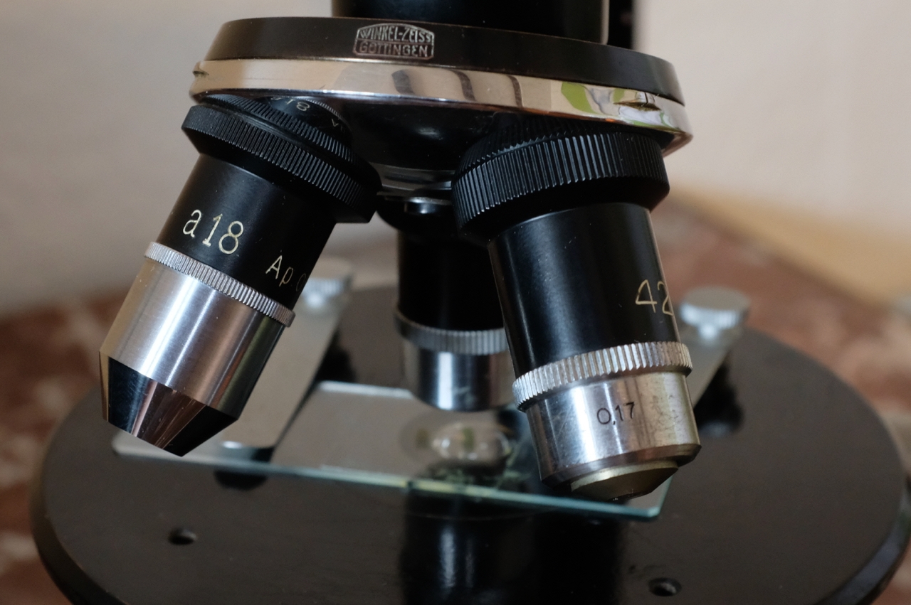 Außer dem Objektiv "a18 Ap. 0,58" sind ein 10/0,25 und ein 40/0,65 eingeschraubt. Das 40/0,85 hatte ich selbst einmal und war davon ziemlich angetan. Was mir jetzt wieder auffällt: Im Netz finde ich nur sehr wenige Informationen zu Winkel-Zeiss-Mikroskopen und -Zubehör. Und von dem "a18 Ap. 0,58" hatte ich noch nie gehört. Wozu brauchte man solch ein extrem hochgeöffnetes Objektiv?