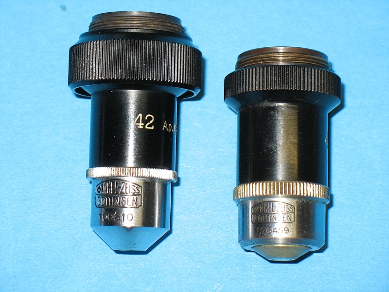 Man kann diese Objektive übrigens über eine spezielle Extenderhülse für die Zeiss Standard übliche Obektivabgleichlänge von 45 mm tauglich machen (zu sehen im folgenden Bild am "spitzkegeligen" 42 x Objektiv):