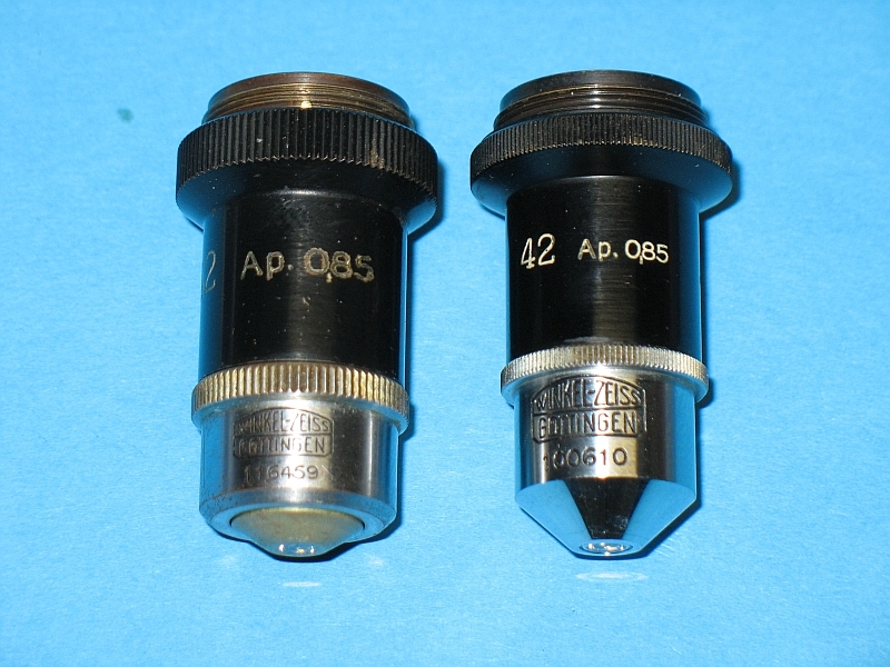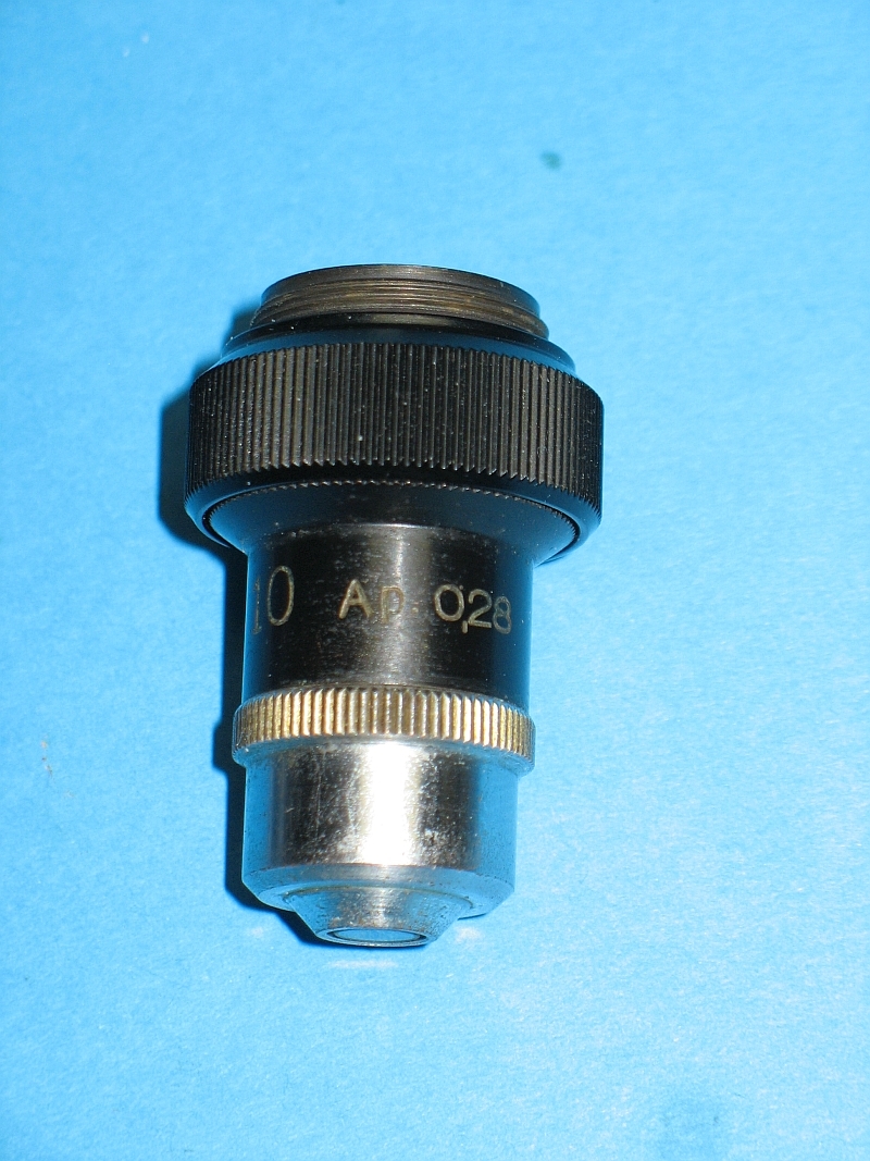 Ich weiss nicht ob du auch ein 10er Objektiv an deinem schönen Mikroskop hast. Diese hatten gegenüber den späteren Modellen eine deutlich höhere Aperturangabe von 0,28 (wie übrigens auch die 42 x Objektive mit 0,85! - das erreichte später nur noch das 40er POL Objektiv). Die neuen Zeiss West 10er Objektive haben dagegen nur noch eine nA von 0,22 und dazwischen gab es Zeiss Winkel mit nA 0,25. Im folgenden das Winkel Zeiss Göttingen 10x Objektiv mit Verlängerungshülse und nA 0,28: