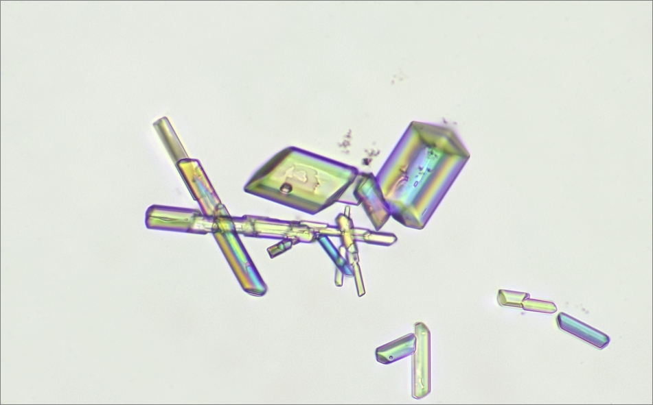 so schön kann Hühnerk...e sein! Bist du mit der Zuordnung sicher? Da ist sicher Harnsäure drin, aber auch noch ne Menge anderes Zeugs. Kristalle sehen aber sehr gut aus. Ich habe Harnsäure in der Sammlung, muss ich mal rausholen. Ich weiß nur, dass sie sehr schlecht löslich ist.